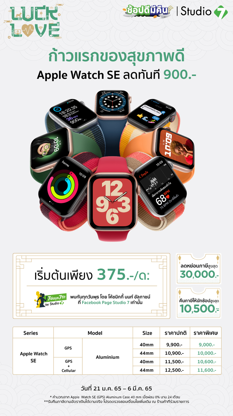 Studio 7 จัดโปร Apple Watch Series SE ลดทันที 900 บาทเริ่มต้นเพียง 9,000 บาท เมื่อซื้อภายใน 15 ก.พ. นี้ นำไปลดหย่อนภาษีกับโครงการช้อปดีมีคืนได้ และยังผ่อน 0% นาน 24 เดือนกับธนาคารที่ร่วมรายการเริ่มต้น 375 บาท/เดือน