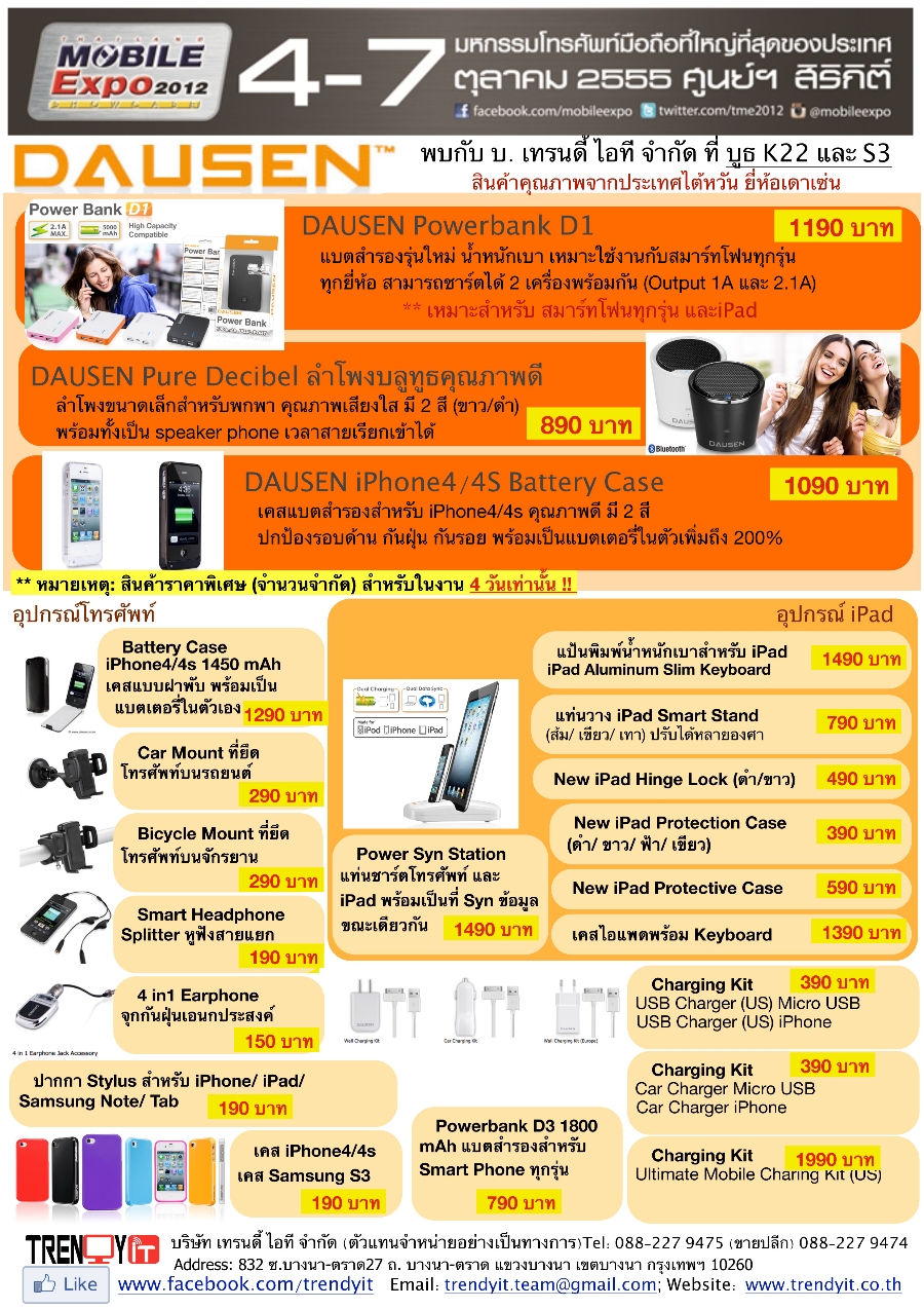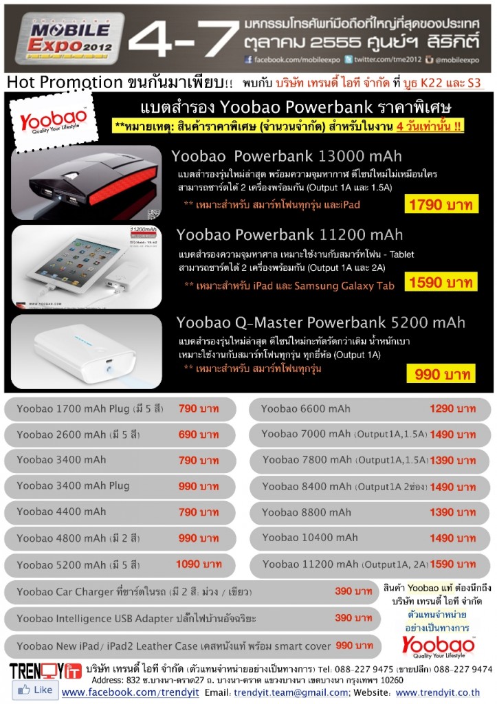 โปรโมชั่น Yoobao Powerbank และเปิดตัวสินค้าใหม่ Dausen อุปกรณ์เสริมในงาน Thailand Mobile Expo 2012 ที่น่าสนใจเป็นพิเศษคือ Yoobao Powerbank 13000 mAh ราคาเพียง 1790 บาท , Yoobao Powerbank 11200 mAh ราคาเพียง 15,90 บาท ที่เหมาะสำหรับแท็บเล็ตพกพา ส่วนใครที่มองหาสำหรับสมาร์ทโฟนอยู่ราคาเพียง 990 บาท คือ Yoobao Q-Master Powerbank 5200 mAh