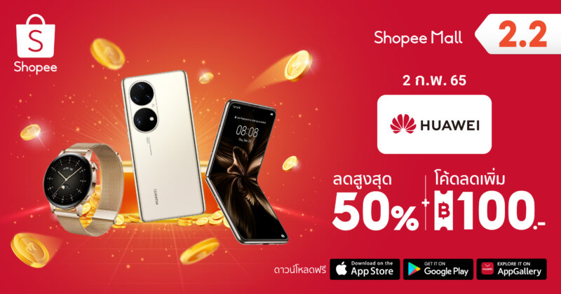 หัวเว่ย (HUAWEI) ผนึกกำลัง ช้อปปี้ (Shopee) ผู้นำแพลตฟอร์มอีคอมเมิร์ซ ในภูมิภาคเอเชียตะวันออกเฉียงใต้และไต้หวัน สร้างสีสันประเดิมศักราชใหม่ จัดแคมเปญใหญ่ลดและให้แบบสุดๆ เพื่อร่วมฉลองการเปิดตัวของสมาร์ทโฟนเรือธงระดับโลกรุ่นล่าสุดแห่งตระกูล P Series 2 รุ่น 2 สไตล์สุดหรูอย่าง HUAWEI P50 Pro สมาร์ทโฟนดีไซน์กล้อง Dual-Matrix ที่อัดแน่นด้วยเทคโนโลยีสุดล้ำ และ HUAWEI P50 Pocket กับสมาร์ทโฟนแบบพับได้ที่มาพร้อมดีไซน์ที่เจิดจรัสไปอีกขั้น กับโปรที่ให้แบบจัดหนักเฉพาะบน Shopee Mall วันที่ 28 มกราคม – วันที่ 11 กุมภาพันธ์ 2565 เท่านั้น!! พร้อมเสิร์ฟความปังต่อเนื่องให้เหล่านักช้อปได้เป็นเจ้าของดีไวซ์สุดล้ำหลากรายการในราคาสุดคุ้มกับแคมเปญ Shopee 2.2 Cashback Sale