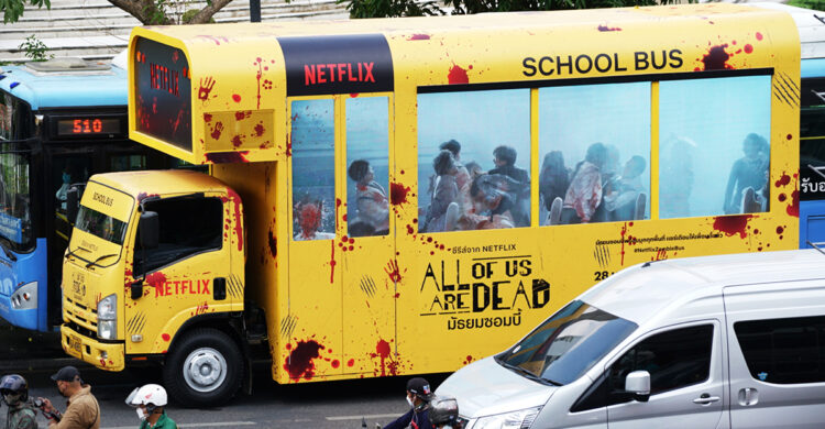 Netflix ประเดิมต้นปีอย่างยิ่งใหญ่ ทุ่มทุนโปรโมตซีรีส์ มัธยมซอมบี้ (All of Us Are Dead) แบบจัดเต็มใจกลางกรุงเทพมหานคร ปลุกกระแส K-Zombie ด้วยความระทึกเมื่อรถบัสทั้งคันถูกพลิกโฉมให้เสมือนเป็นรถโรงเรียนที่หลุดออกมาจากสมรภูมิซอมบี้ ต้อนรับการเปิดตัวของซีรีส์ มัธยมซอมบี้ (All of Us Are Dead) ที่พร้อมให้ชมได้แล้ววันนี้ที่ Netflix เท่านั้น