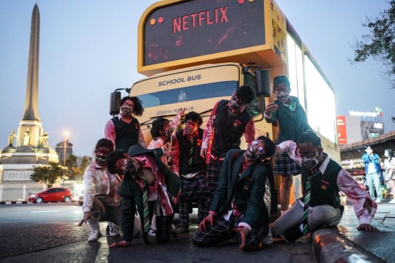 เพื่อส่งมอบประสบการณ์สุดระทึกจากเหตุการณ์ที่เกิดขึ้นในโรงเรียนมัธยมฮโยซาน ซึ่งเป็นสถานที่หลักในซีรีส์ มัธยมซอมบี้ (All of Us Are Dead) ให้แฟนๆ ชาวไทยได้อินไปด้วยยิ่งกว่าเคย Netflix เตรียมกิจกรรมสุดตื่นเต้นเอาไว้มากมาย เริ่มจากการ wrap รถบัสทั้งคันให้เหมือนหลุดออกมาจากซีรีส์ พร้อมภาพตัวละครและองค์ประกอบชวนขนลุกต่างๆที่ทำให้รู้สึกราวกับการผ่านสมรภูมิเอาชีวิตรอดอันดุเดือด โดยรถบัสจะตระเวนไปตามจุดต่างๆ กลางกรุงเทพมหานครเพื่อให้แฟนๆ ซีรีส์ได้ร่วมสัมผัสประสบการณ์สุดเซอร์ไพรส์นี้ด้วยตนเอง ไม่ว่าจะเป็นที่อนุสาวรีย์ชัยสมรภูมิ, แยกอโศก, แยกสาทร, ถนนหน้าห้างสรรพสินค้าเซ็นทรัลเวิลด์, เซ็นทรัลพระราม 9, สยามสแควร์ และสามย่านมิตรทาวน์ ตั้งแต่วันนี้จนถึงวันที่ 1 กุมภาพันธ์ 2565