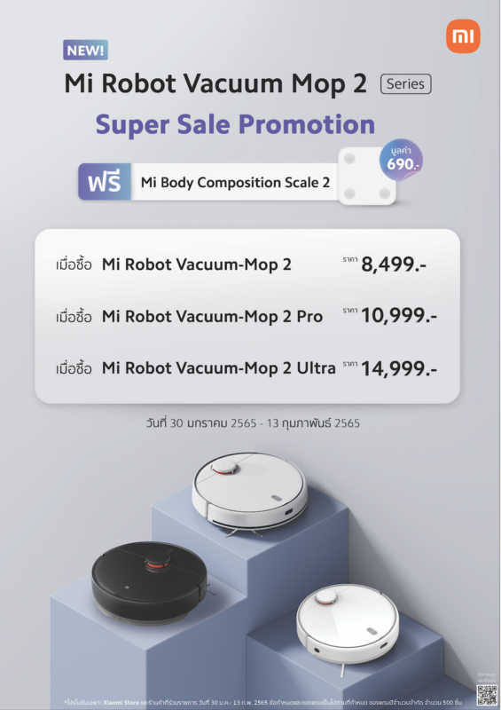 Mi Robot Vacuum Mop 2 (สีขาว)8,499 บาทเมื่อซื้อระหว่าง 30 มกราคม – 13 กุมภาพันธ์ 2565 รับ Mi Body Composition Scale 2 มูลค่า 2,690 บาท ฟรี30 มกราคม 2565วางจำหน่ายผ่าน Xiaomi Store ทุกสาขา, ร้านค้าที่ร่วมรายการและช่องทางออนไลน์อย่างเป็นทางการ