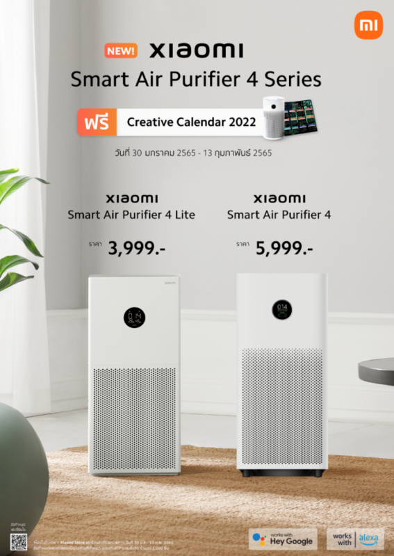 Xiaomi Smart Air Purifier 4 Lite (สีขาว)3,999 บาทเมื่อซื้อระหว่าง 30 มกราคม – 13 กุมภาพันธ์ 2565 รับปฏิทิน Xiaomi มูลค่า 290 บาท ฟรี30 มกราคม 2565วางจำหน่ายผ่าน Xiaomi Store ทุกสาขา, ร้านค้าที่ร่วมรายการและช่องทางออนไลน์อย่างเป็นทางการ