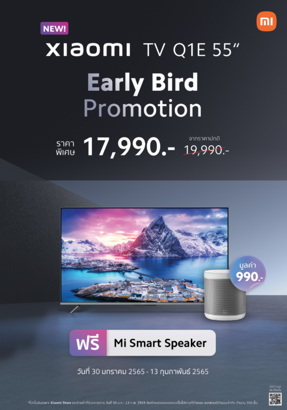 Xiaomi TV Q1E 55” 19,990 บาทเมื่อซื้อระหว่าง 30 มกราคม – 13 กุมภาพันธ์ 2565 ราคาพิเศษ 17,990 บาท พร้อมรับ Mi Smart Speaker มูลค่า 990 บาท ฟรี30 มกราคม 2565วางจำหน่ายผ่าน Xiaomi Store สาขาที่ร่วมรายการ, ร้านค้าที่ร่วมรายการและช่องทางออนไลน์อย่างเป็นทางการ