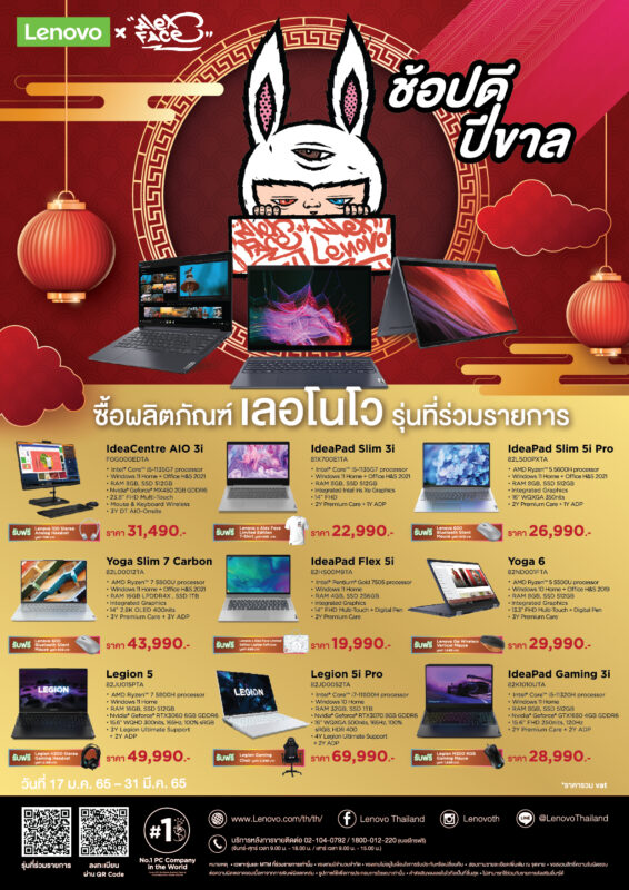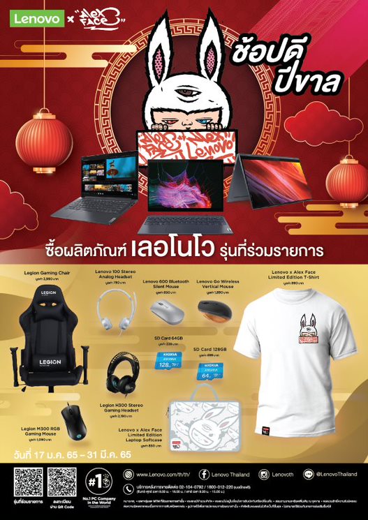 เลอโนโว บริษัทผู้นำด้านคอมพิวเตอร์และสมาร์ทดีไวซ์ระดับโลก จับมือกับ Alex Face จัดแคมเปญโปรโมชั่นผลิตภัณฑ์คอมพิวเตอร์แล็ปท็อป และเดสก์ท็อปราคาพิเศษ ต้อนรับปีขาล 2565 กันแบบจุก ๆ ทั้งโปรโมชั่นราคาพิเศษ และของแถมสุดคิ้วจาก Lenovo และ Alex Face รับฟรีกันทุกออเดอร์กันแบบจัดเต็มไม่จกตา สำหรับรุ่นที่ร่วมรายการ ได้แก่ IdeaCentre AIO, IdeaPad, Yoga, IdeaPad gaming และ Legion เรียกได้ว่าขนแทบทุกรุ่นตัวท็อปจากเลอโนโวมาจัดโปรโมชั่นกันเลยทีเดียว นอกจากนี้ยังมีของสมนาคุณอีกมากมาย เช่น เมาส์ไร้สาย, หูฟัง, กระเป๋าแล็ปท็อป Alex Face รุ่น limited Edition, เสื้อเชิ้ต Alex Face รุ่น limited Edition และเก้าอี้เกมมิ่ง โดยโปรโมชั่นเริ่มตั้งแต่วันนี้ – 31 มีนาคม พ.ศ. 2565 เท่านั้น และพิเศษ! โปรโมชั่น cash back 24 มกราคม – 6 กุมภาพันธ์ มูลค่าสูงสุด 4,000 สำหรับรุ่นที่ร่วมรายการ