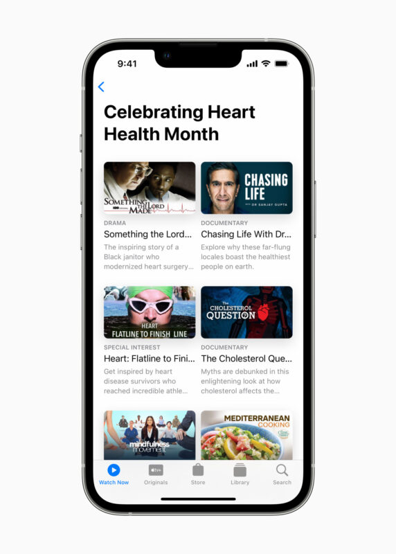 Apple Books มาพร้อมคอลเลกชั่นหนังสือที่เน้นเรื่องสุขภาพหัวใจ รวมถึงหนังสือเกี่ยวกับวิทยาศาสตร์หัวใจ ความผาสุกทางอารมณ์ และการกินเพื่อสุขภาพ ส่วนผู้ชมแอป Apple TV จะได้พบกับคอลเลกชั่นภาพยนตร์และรายการเกี่ยวกับโรคหัวใจ วิทยาศาสตร์ด้านหัวใจ และการใช้ชีวิตเพื่อสุขภาพที่ดี ผู้ฟังสามารถค้นหากลุ่มพ็อดคาสท์ยอดนิยมที่ได้รับการคัดสรรมาแล้วบนแถบ “เลือกหา” บน Apple Podcasts ซึ่งประกอบด้วยพ็อดคาสท์ที่จัดโดยผู้เชี่ยวชาญทางการแพทย์ที่จะช่วยให้ผู้ฟังได้เรียนรู้เพิ่มเติมเกี่ยวกับสุขภาพของตนเองและขั้นตอนที่พวกเขาสามารถนำไปใช้เพื่อพัฒนาความแข็งแรงสมบูรณ์โดยรวม ไปจนถึงความฟิตของร่างกายและการทำสมาธิ