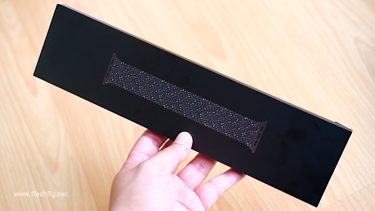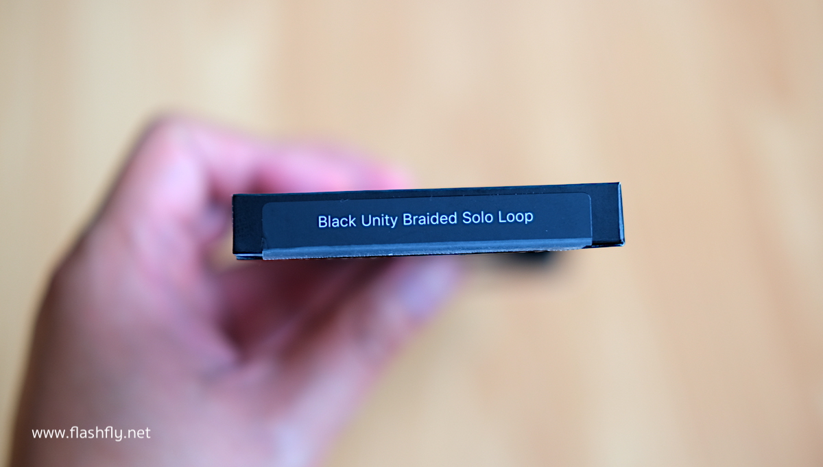 สาย Apple Watch แบบ Braided Solo Loop รุ่น Black Unity ถูกจัดส่งมาในกล่องสีดำ หน้ากล่องพิมพ์รูปภาพสายไว้อย่างชัดเจน หลังกล่องให้รายละเอียดเหมือนสาย Apple Watch รุ่นอื่นๆ โดยระบุชื่อรุ่นของสายและขนาดไว้บนฉลากสติกเกอร์