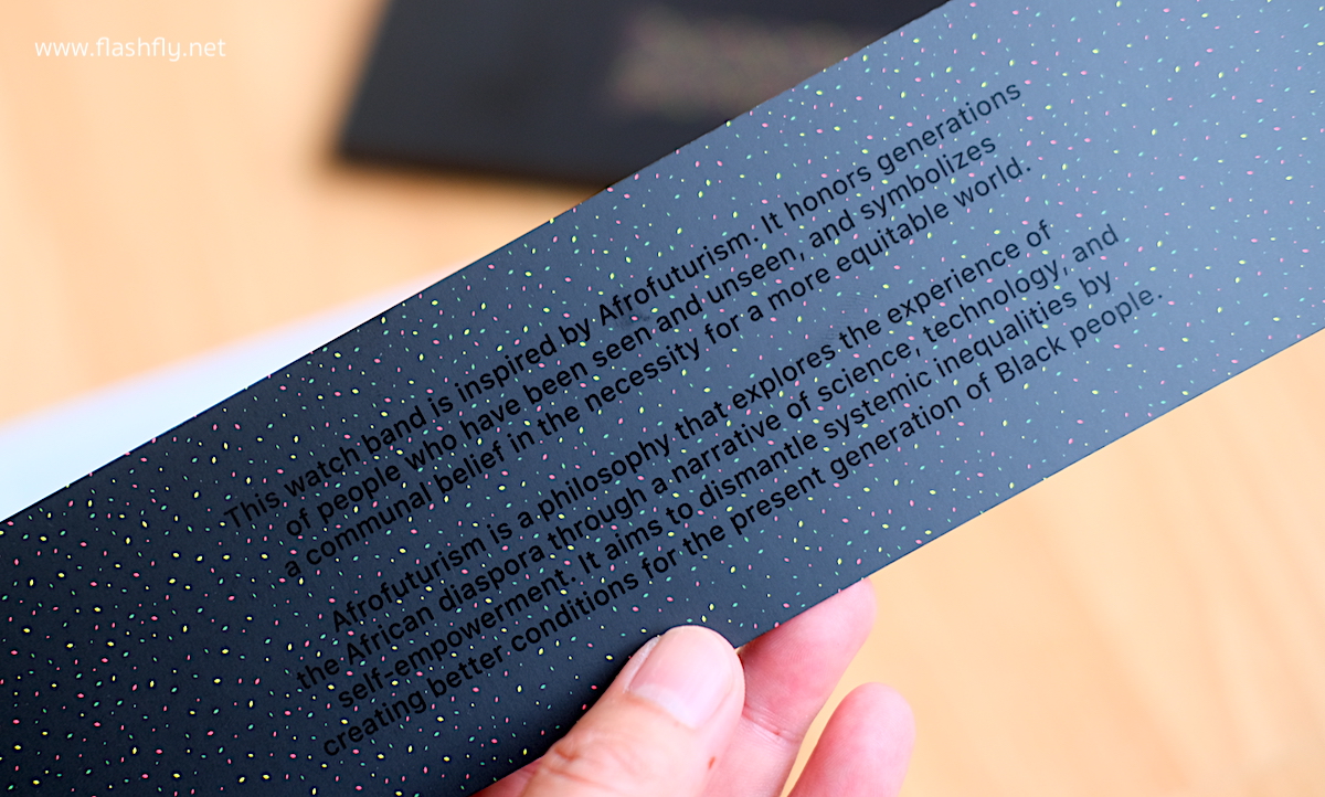 ภายในกล่องจะพบกับแผ่นเอกสารสีดำธีมเดียวกับสาย Braided Solo Loop รุ่น Black Unity พร้อมพิมพ์ข้อความด้วยสีดำ ทำให้อ่านยาก แต่ก็พอจับใจความได้ว่า สายรุ่นนี้ได้รับแรงบันดาลใจมาจากแนวคิด Afrofuturism ซึ่งเป็นปรัชญาที่ถ่ายทอดจากประสบการณ์ของคนผิวดำผ่านเรื่องเล่าทางวิทยาศาสตร์ เทคโนโลยี และการสร้างพลังในตัวเอง