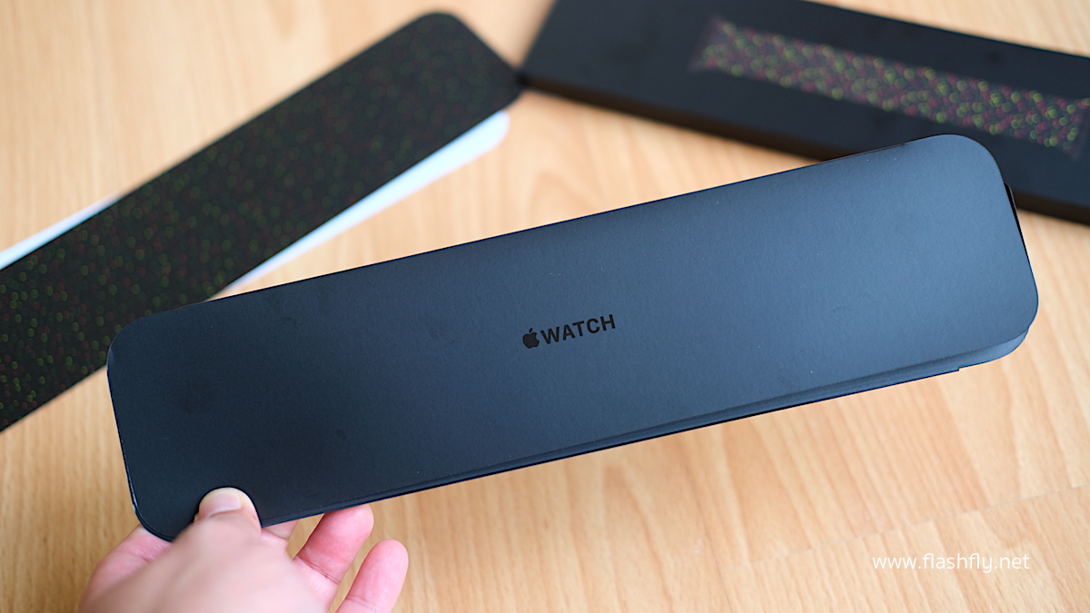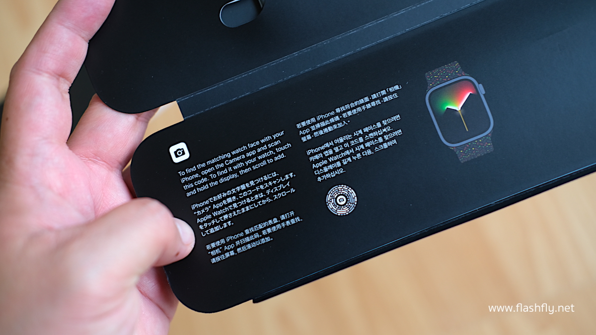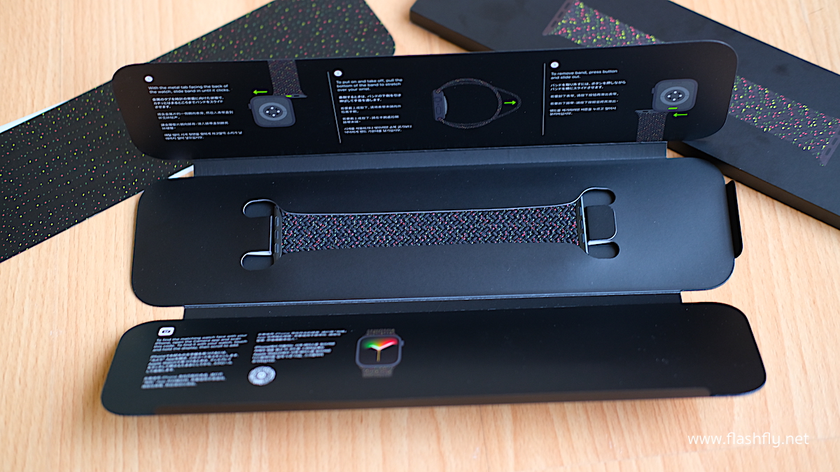 สาย Braided Solo Loop รุ่น Black Unity ถูกเก็บไว้ในแผ่นพับสีดำ ภายในมีคำแนะนำการใส่สาย และแนะนำการเปลี่ยนหน้าปัด ด้วยการใช้ iPhone สแกนรหัสที่พิมพ์ไว้ในแผ่นพับ