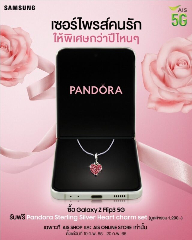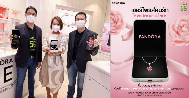 นวินดา นาคเกษม Head of Premium Brands Strategic Marketing บริษัท ธนจิรา รีเทลคอร์ปอเรชั่น จำกัด ผู้นำเข้าและจัดจำหน่ายแบรนด์แพนดอร่า (Pandora)เครื่องประดับและจิวเวลรีชื่อดังสัญชาติเดนมาร์ก พร้อมด้วย นายฐติภศ สิมะวานิชกุล ผู้อำนวยการฝ่ายขาย บริษัท ไทยซัมซุง อิเลคโทรนิคส์ จำกัด และนายทิฐินันท์ โชตินันทน์ หัวหน้าส่วนงานการตลาดด้านผลิตภัณฑ์และลูกค้าโพสต์เพด เอไอเอส ส่งแคมเปญโปรโมชั่นพิเศษต้อนรับเดือนแห่งความรัก หวังสร้างสีสันในช่วงเทศกาล พร้อมตอบโจทย์ไลฟ์สไตล์ และความต้องการของกลุ่มลูกค้าคนรุ่นใหม่ ในระดับพรีเมียมเซกเมนต์ (Premium Segment) ซึ่งแคมเปญการตลาดร่วมกันครั้งนี้ คาดว่าจะสามารถสร้างการรับรู้ กระตุ้นการช็อปเพื่อเป็นของขวัญให้คนพิเศษในวงกว้างได้มากยิ่งขึ้น โดยลูกค้าที่ซื้อ Galaxy Z Flip3 5G รับฟรี Pandora Sterling Silver Heart Charm Set ทันที (มูลค่า 1,290 บาท)  เฉพาะที่ AIS Shop และ AIS Online Store เท่านั้น เริ่มตั้งแต่วันนี้ ถึง 20 กพ.65