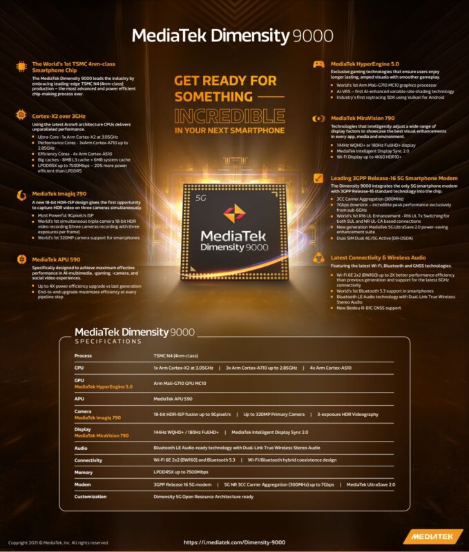 ชิป MediaTek Dimensity 9000 โดดเด่นที่สุดในวงการด้วยเทคโนโลยีการผลิต TSMC N4 (คลาส 4nm) อันล้ำสมัย ซึ่งเป็นกระบวนการผลิตชิปที่ล้ำหน้าและทำให้ชิปประหยัดพลังงานได้มากที่สุดเท่าที่เคยมีมา