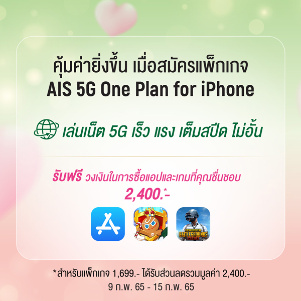 เป็นเจ้าของ iPhone 13 ทุกรุ่น จาก AIS พร้อมข้อเสนอพิเศษต้อนรับวาเลนไทน์ และได้รับสิทธิพิเศษอีกมากมาย ได้ตั้งแต่วันนี้ ไปจนถึงวันที่ 15 กุมภาพันธ์ 2565 เท่านั้น นอกจากนี้ AIS ยังแนะนำแพ็กเกจใหม่ เล่นเน็ต 5G เร็ว แรง เต็มสปีด 20GB เริ่มเพียง 599 บาท