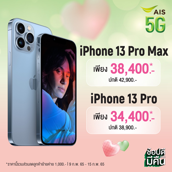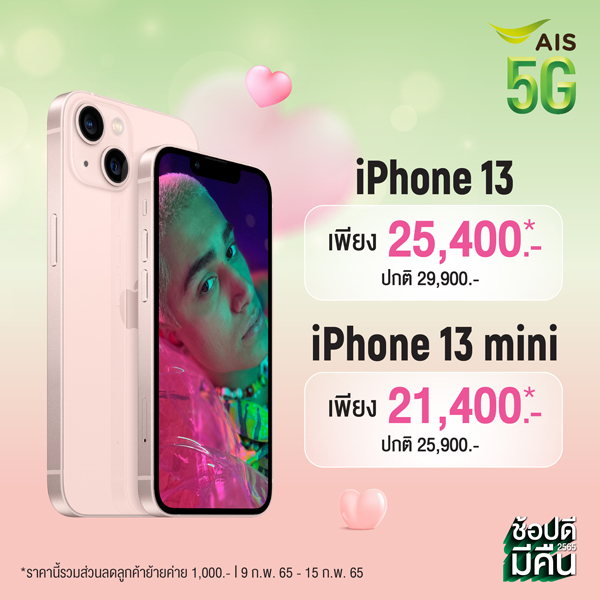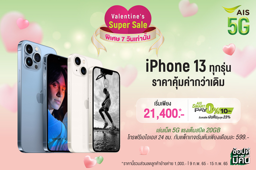 AIS ต้อนรับช่วงเทศกาลวันแห่งความรัก นำเสนอ iPhone 13 ทุกรุ่น ในราคาสุดพิเศษ เริ่มต้นเพียง 21,400 บาท สามารถผ่อนสบายๆ 0% นาน 10 เดือน กับ AIS Smart Pay พร้อมรับเครดิตเงินคืนสูงสุด 23% อีกทั้งยังสามารถใช้สิทธิ์ช้อปดีมีคืน ลดหย่อนภาษีได้สูงสุด 30,000 บาท