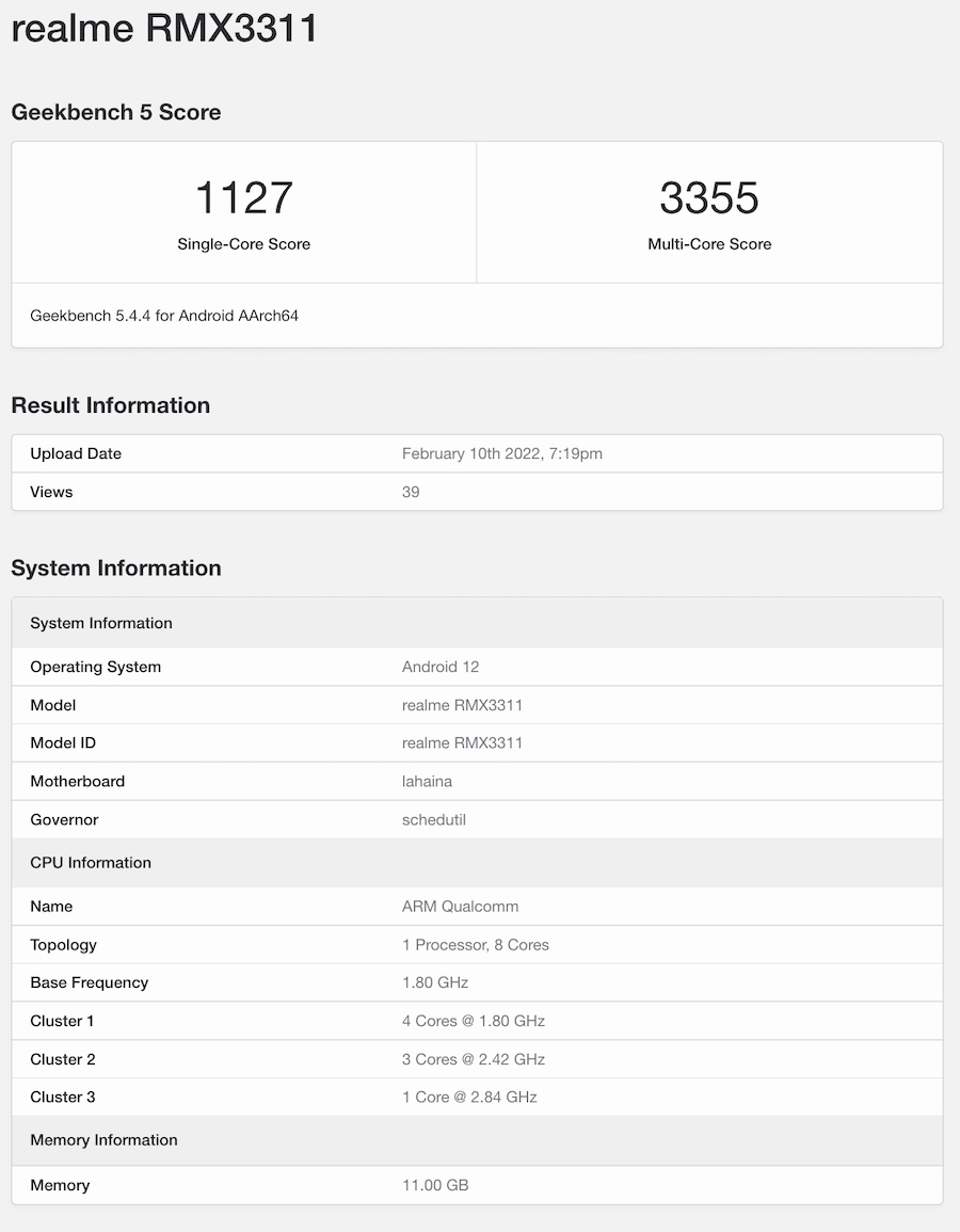 realme GT 2 ถูกทดสอบประสิทธิภาพแล้วบนแอปพลิเคชั่น Geekbench ซึ่งยืนยันว่าใช้ชิปประมวลผล Qualcomm Snapdragon 888 ความจำ RAM 12GB ทำงานบนพื้นฐาน Android 12 แตกต่างจาก realme GT 2 Pro ที่ได้รับชิปรุ่นใหม่ Qualcomm Snapdragon 8 Gen 1