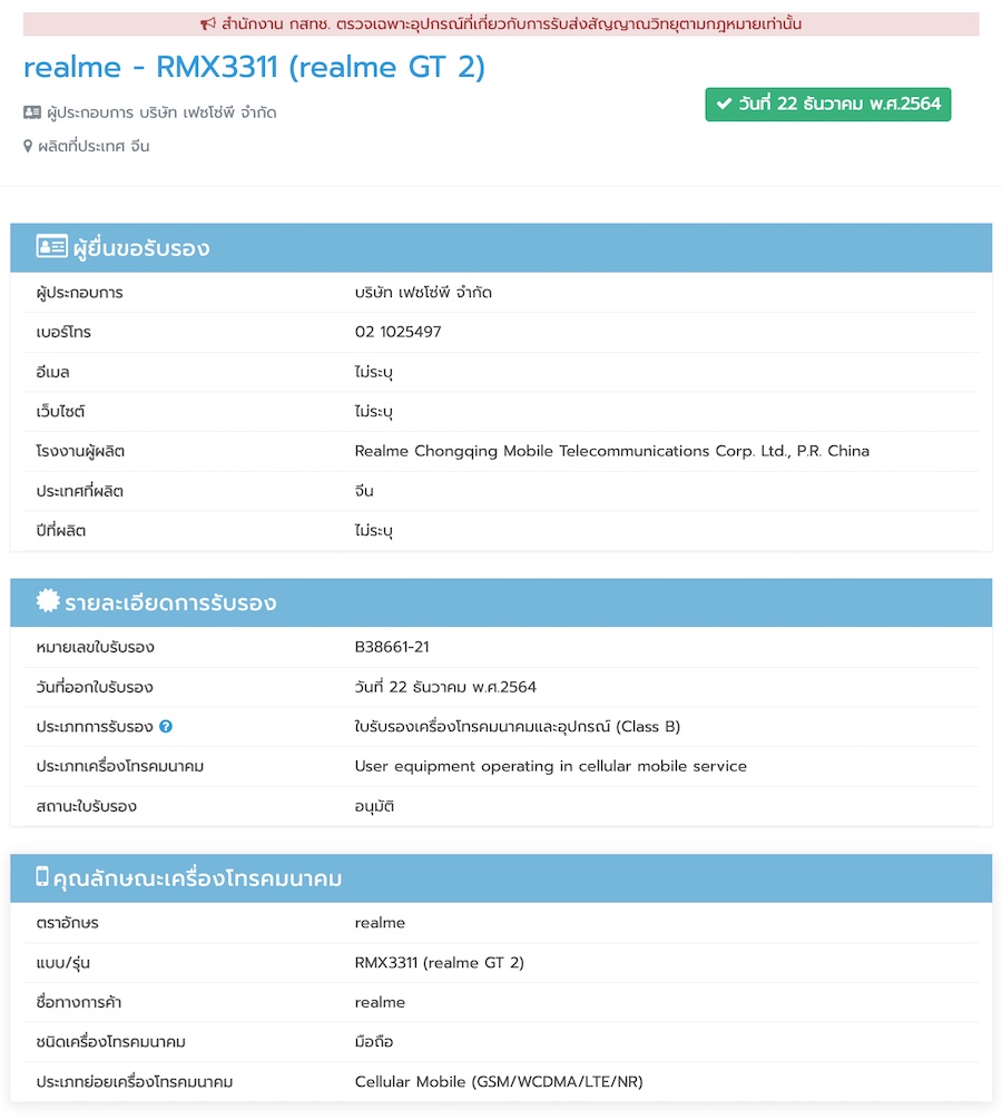 หลังจากหน่วยงาน กสทช. ของไทยให้การรับรอง realme GT 2 Pro ไปก่อนหน้านี้ ล่าสุด realme GT 2 ก็ผ่านการรับรองแล้วเช่นกัน มาในรหัสรุ่น RMX3311 (ส่วนรุ่น Pro ใช้รหัสรุ่น RMX3301) รองรับเครือข่าย 3G – 5G (GSM/WCDMA/LTE/NR)