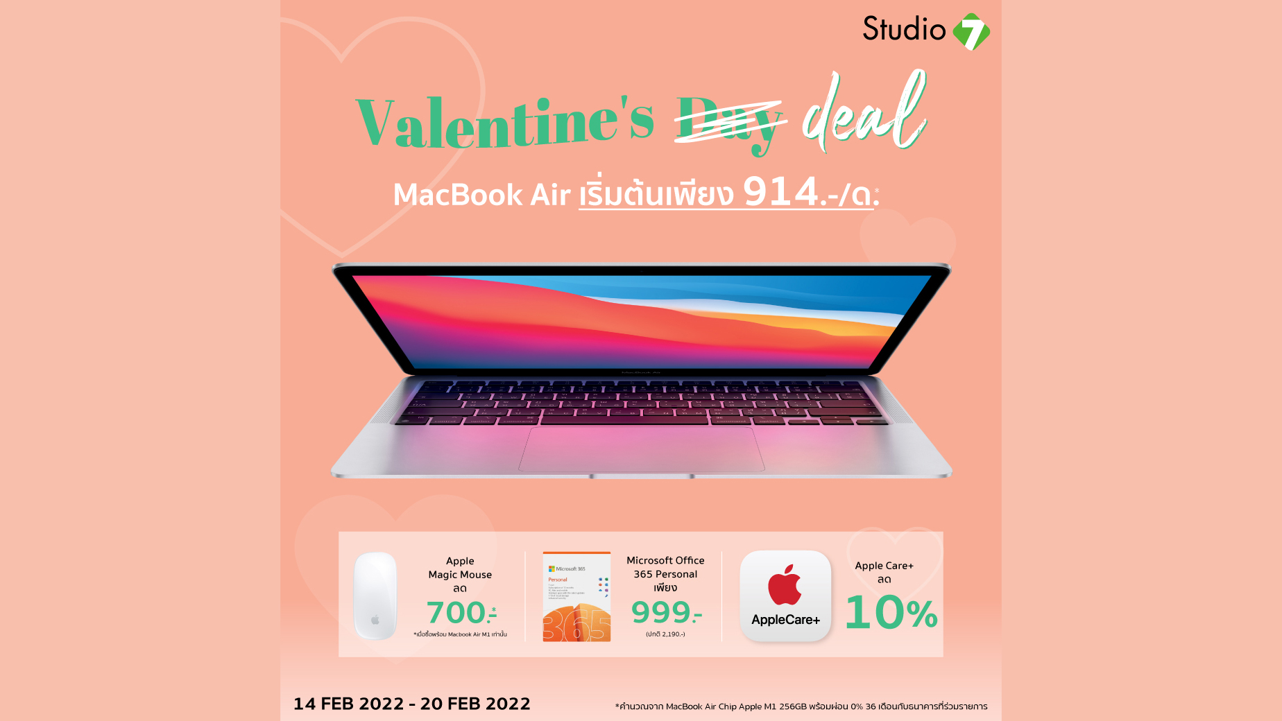 Studio 7 จัดโปรโมชั่นต้อนรับวันวาเลนไทน์ ซื้อ MacBook Air เป็นเซ็ทประหยัดกว่า โดยได้รับส่วนลดสูงสุด 2,900 บาท ตั้งแต่วันที่ 14-20 กุมภาพันธ์ 2565