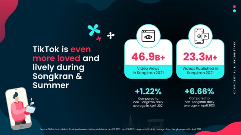 เทศกาลสงกรานต์เป็นเทศกาลสำคัญ และเป็นวันหยุดยาวที่สุดในรอบปีของไทย ซึ่งตรงกับช่วงซัมเมอร์ที่เด็กๆ ปิดเทอมพอดี ความเข้าใจส่วนใหญ่ของแบรนด์และธุรกิจจึงเชื่อว่า เป็นช่วงเวลาที่ไม่ควรลงทุนทำแคมเปญการตลาดใดๆ ในแพลตฟอร์มออนไลน์ แต่ที่ TikTok ผู้ใช้ 58% ใช้เวลาบนแพลตฟอร์มดิจิทัลมากขึ้นในช่วงสงกรานต์ เพื่อติดตามข่าวสารข้อมูลและเชื่อมโยงกับครอบครัวและเพื่อนๆ นอกจากนี้ยังพบว่าผู้ใช้ TikTok 54% ใช้เวลาวันหยุดเพื่ออยู่บ้านเป็นส่วนใหญ่ ซึ่งจากข้อมูลเชิงลึกของ TikTok พบว่ามีการดูวิดีโอเพิ่มสูงขึ้นและการมีส่วนร่วมสูงมากกว่า 10 ครั้งใน 1 นาที โดยในสัปดาห์สงกรานต์ ระหว่าง 10-18 เมษายน พ.ศ. 2564 พบยอดวิววิดีโอเกือบ 47 พันล้านครั้ง แ ละจำนวนนี้เพิ่มขึ้นเกือบ 2% เมื่อเทียบกับค่าเฉลี่ยรายวันที่ไม่ใช่ช่วงสงกรานต์ในเดือนเดียวกัน นอกจากนี้ ผู้ใช้ยังชอบสร้างและเผยแพร่เนื้อหาบน TikTok ในช่วงนี้ด้วยเช่นเดียวกัน มีวิดีโอที่ถูกเผยแพร่มากถึง 23.3 ล้านวิดีโอ ซึ่งสูงกว่าค่าเฉลี่ยรายวันในเดือนเมษายน 2564 ถึง +6.6% จากสถิติตรงนี้ชี้ให้เห็นว่าคนไม่ได้เข้า TikTok น้อยลงในช่วงเทศกาลแต่ยังเข้ามามากขึ้นและมีส่วนร่วมมากขึ้น นอกจากนี้ จากการสำรวจยังพบข้อมูลอินไซด์ว่า มากกว่า 50% ของผู้ใช้ TikTok บอกว่าพวกเขานิยมซื้อของออนไลน์ในช่วงเทศกาลสงกรานต์ โดยมีการซื้อต่อเนื่องตั้งแต่ช่วงก่อน ระหว่างและหลังเทศกาล ซึ่งช่วงที่มีการใช้จ่ายมากเป็นพิเศษคือ 1 สัปดาห์ก่อนเทศกาลสงกรานต์