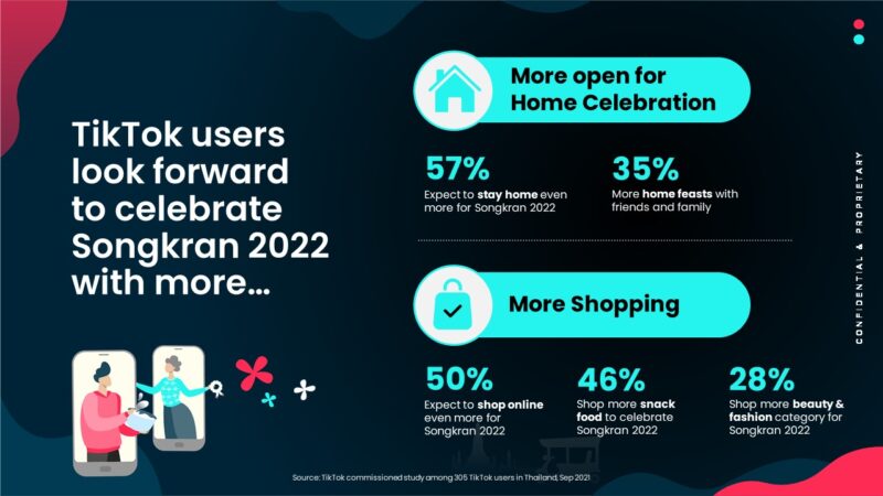 ปีนี้ผู้ใช้ TikTok เปิดรับการฉลองที่บ้านมากขึ้นและช้อปปิ้งมากขึ้น จากการสำรวจเมื่อเดือนกันยายน 2564 พบว่าผู้ใช้ TikTok 57% คาดว่าจะอยู่บ้านมากขึ้นในช่วงสงกรานต์ปี 2565 และ 35% เชื่อว่าจะมีการจัดงานเลี้ยงที่บ้าน ได้ใช้เวลากับเพื่อนและครอบครัวมากขึ้น นอกจากนี้ยังคาดหวังว่าจะได้ช้อปปิ้งออนไลน์มากขึ้นในช่วงสงกรานต์ปี 2565 โดยเฉพาะอย่างยิ่ง สินค้าอุปโภคบริโภค อาหารและเครื่องดื่ม ความงาม และแฟชั่น ของใช้ในบ้านและตกแต่งบ้าน ทั้งนี้ ผู้ใช้ TikTok เกือบ 7 ใน 10 คน ยังหวังว่าจะฉลองสงกรานต์แบบก่อนมีสถานการณ์โควิดได้ในปีนี้