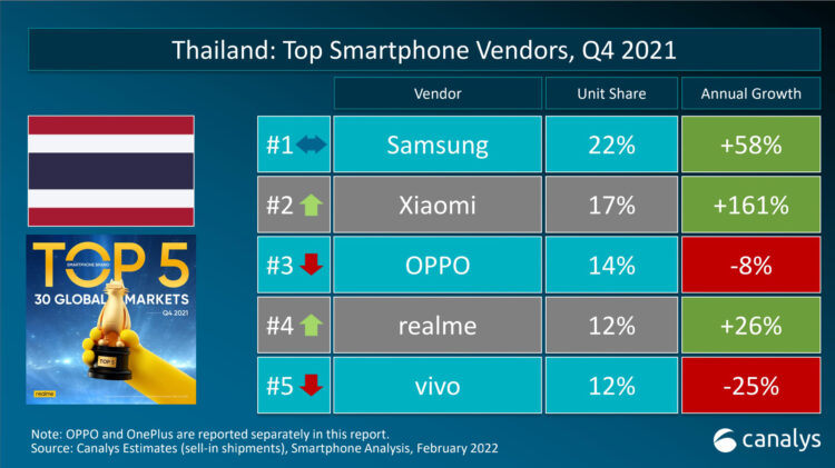 realme แบรนด์น้องใหม่ที่สุดในบรรดา 6 แบรนด์สมาร์ตโฟนชั้นนำของโลก ยังคงรักษาอันดับการเติบโตที่แข็งแกร่งและขยับทำผลงานได้ดีอย่างต่อเนื่อง ตามค่านิยมหลักของ realme คือ “Dare to Leap” โดยล่าสุด จากข้อมูลล่าสุดของ Canalys พบว่า ในไตรมาสที่ 4 ของปี 2564 realme มีส่วนแบ่งการตลาดอยู่ในอันดับที่ 5 กว่า 30 ตลาด ใน 6 ภูมิภาคทั่วโลก โดยมีตลาดใหม่ๆ ที่ติดอันดับในครั้งนี้ด้วย ได้แก่ เยอรมนี เปรู โคลอมเบีย และภูมิภาคยุโรปตะวันตกในยุโรป
