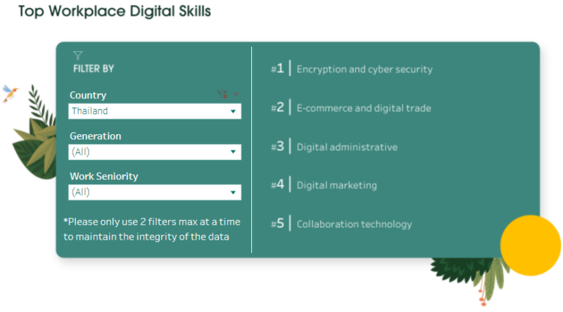จากผลสำรวจพบว่า ผู้ตอบแบบสำรวจคนไทยมากกว่าครึ่งหรือ 51% รู้สึกว่าตนมีทักษะด้านดิจิทัลที่เพียงพอสำหรับการทำงานในปัจจุบัน ซึ่งสูงกว่าเปอร์เซ็นเฉลี่ยของผู้ตอบแบบสำรวจทั่วโลก(40%) อย่างไรก็ตามแม้ผู้ตอบแบบสำรวจคนไทยเกินครึ่งรู้สึกว่าตนมีความพร้อมในเชิงทักษะดิจิทัลในที่ทำงาน แต่มีเพียง 42% เท่านั้นที่สามารถเข้าถึงแหล่งการเรียนรู้ทักษะดิจิทัลได้ ซึ่งนอกจากนี้ผู้ตอบแบบสำรวจชาวไทยจำนวน 43% ได้กำลังวางแผนที่จะเรียนรู้และฝึกอบรมทักษะด้านดิจิทัลอย่างจริงจังในอนาคตข้างหน้าอีกด้วย