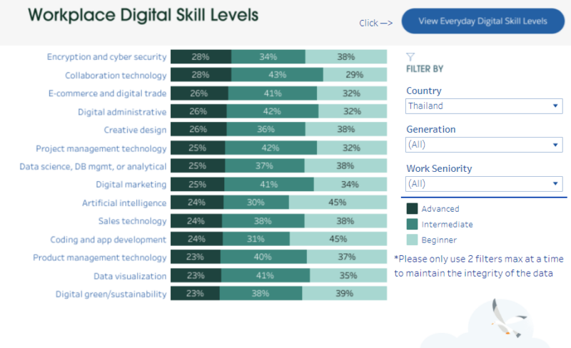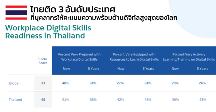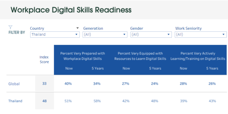 สำหรับประเทศไทย ผู้ตอบแบบสำรวจให้คะแนนความพร้อมต่อทักษะทางดิจิทัลของตนเองสูงที่สุดเป็นอันดับที่ 3 (48 จาก 100 คะแนน) โดย 51% ของผู้ตอบแบบสำรวจคนไทยลงความเห็นว่า ตนเองมีความพร้อมด้านทักษะทางดิจิทัลสำหรับการทำงาน และ 39% พร้อมต่อการเรียนรู้ทักษะดิจิทัลใหม่ ๆ
