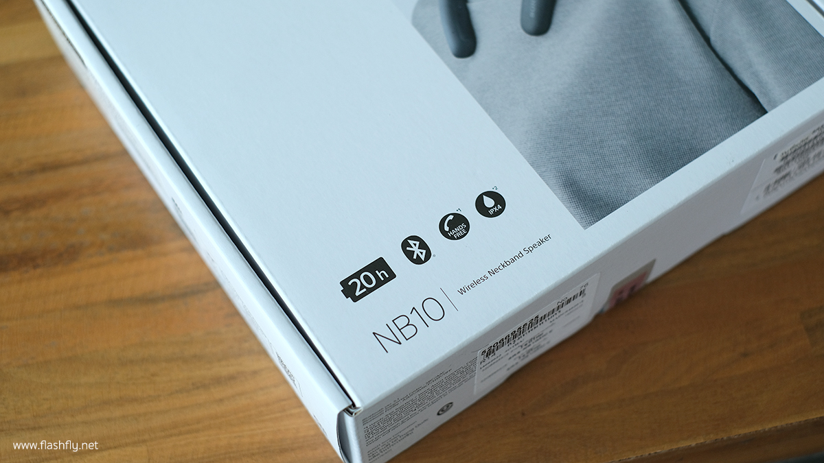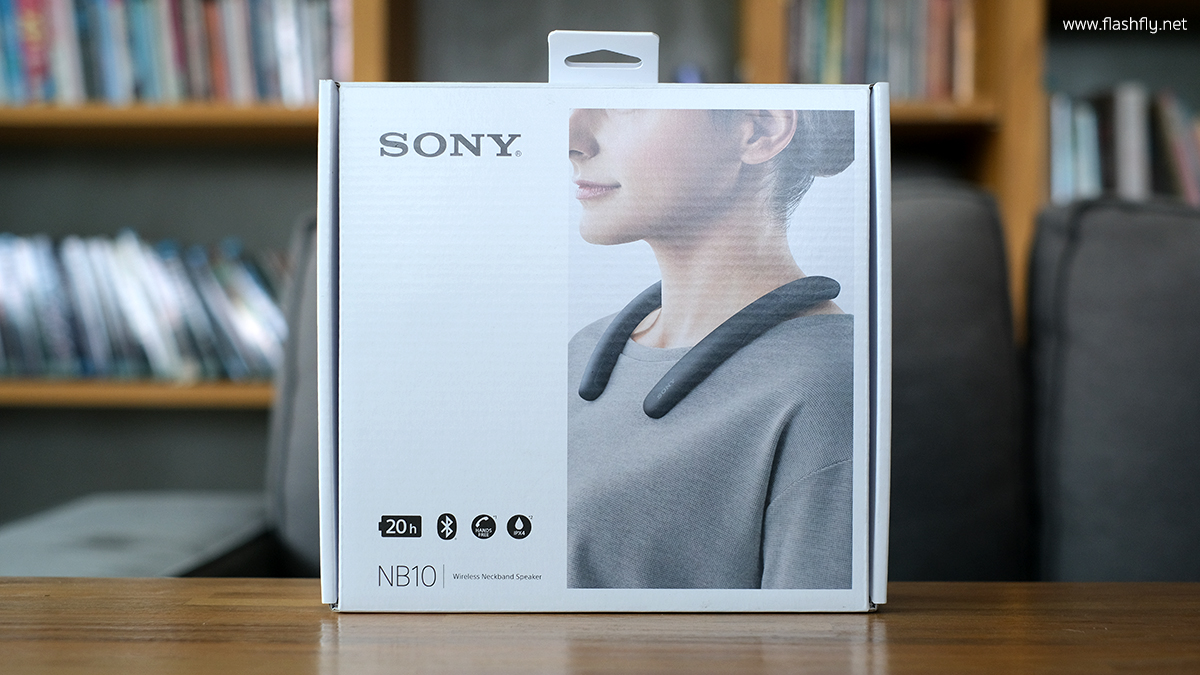 กล่องของ Sony SRS-NB10 มาในกล่องสีขาวพร้อมกับมีการพิมพ์รูปภาพลำโพงไร้สายแบบคล้องคออยู่ด้านหน้ากล่อง และมีพิมพ์จุดเด่นอย่างแบตเตอรี่ใช้งานได้นาน 20 ชั่วโมง, เชื่อมต่อบลูทูธ, รองรับแฮนด์ฟรี และมาตรฐานทนน้ำ IPX4