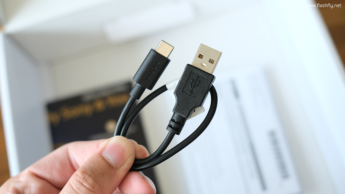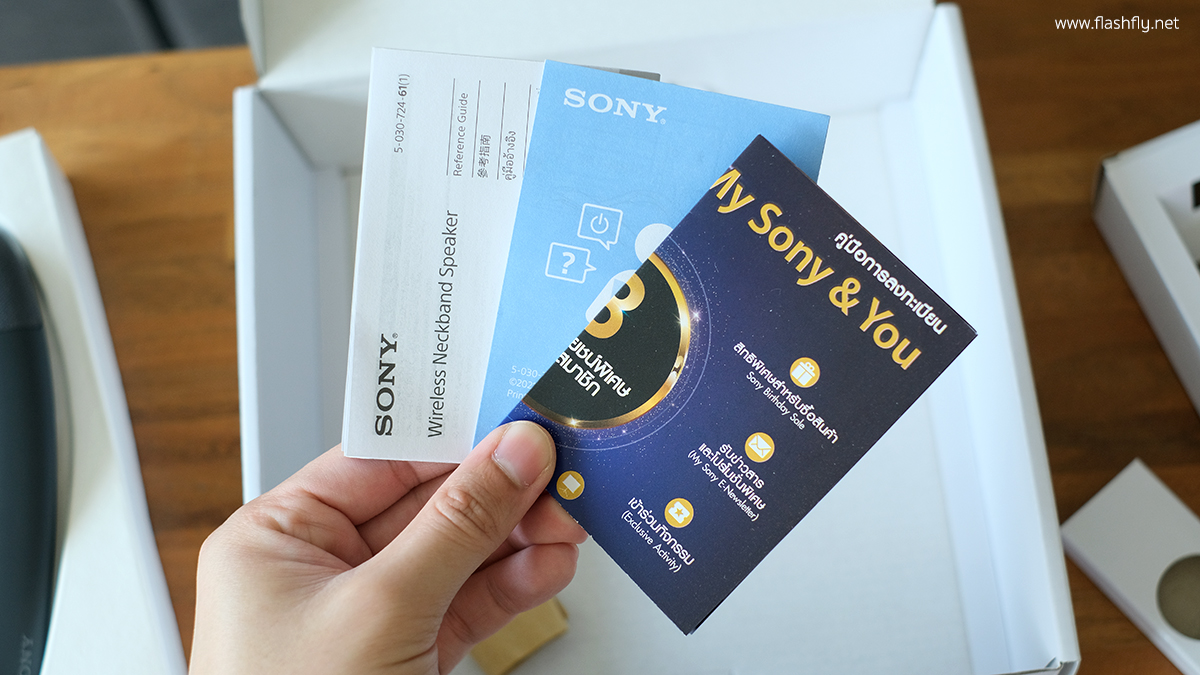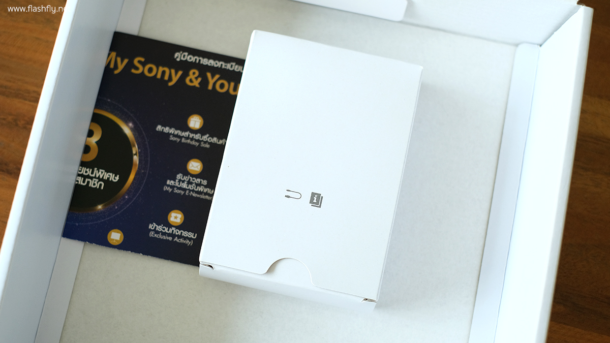 เมื่อเปิดออกมาก็จะพบกับ Sony SRS-NB10 วางอยู่ และเมื่อยกออกมาก็จะพบกับกล่องใส่เอกสารต่างๆ โดยภายในกล่องก็จะมีคู่มือ, สาย USB-C สำหรับชาร์จไฟ และใบระบประกันที่วางอยู่ภายนอก