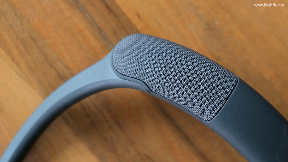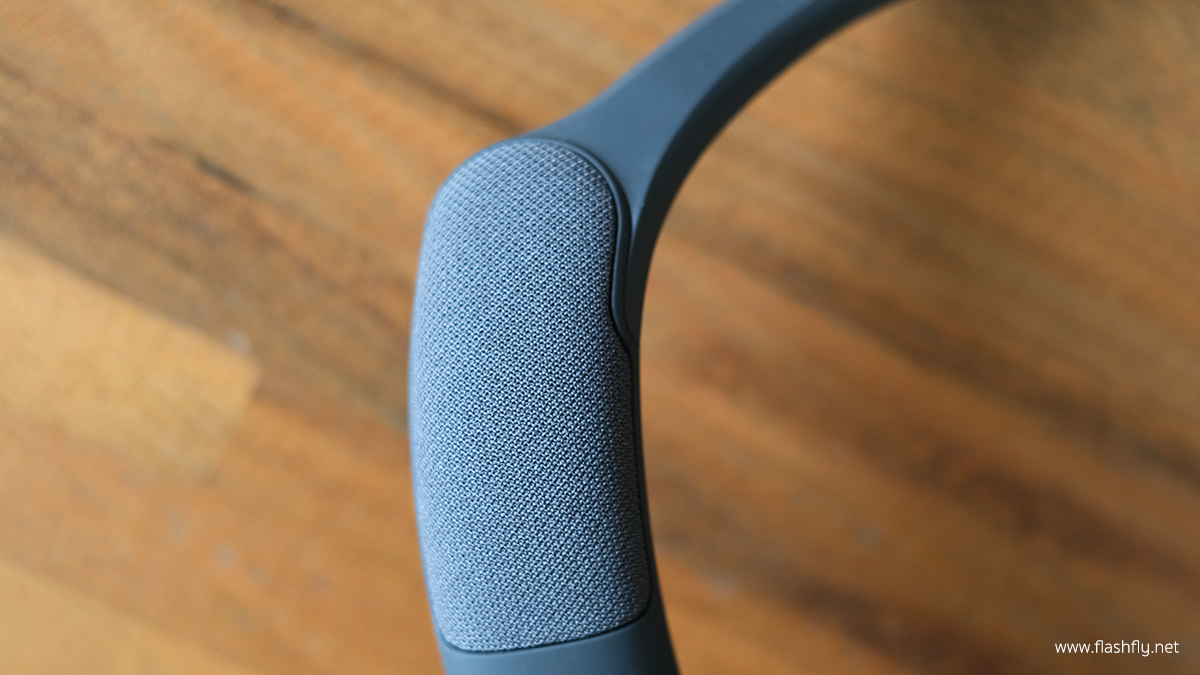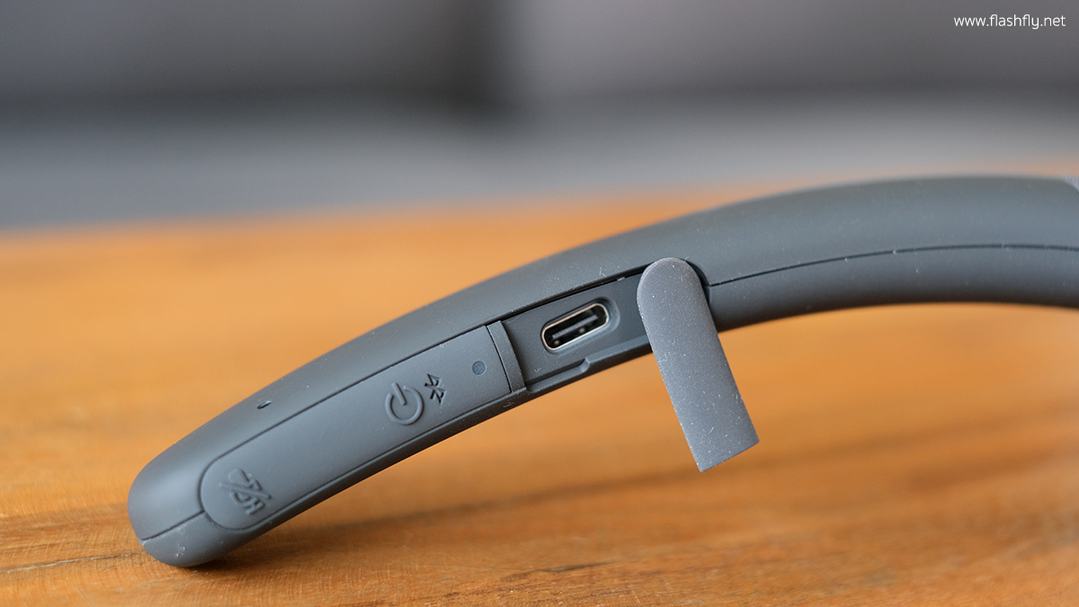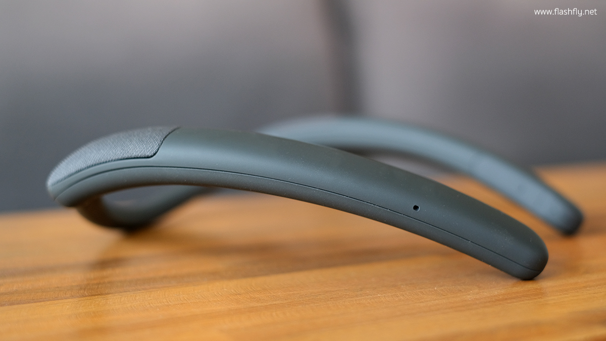 โดยทั้งสองฝั่งจะมีลำโพงที่วางอยู่ด้านบนเพื่อให้ใกล้กับใบหูมากที่สุด ส่วนขาด้านขวาจะมีรูไมโครโฟนเพื่อทำหน้าที่รับเสียงเวลาสนทนา และด้านในก็จะปุ่มปิดไมโครโฟนและปุ่ม Power โดยจะใช้ร่วมกับปุ่มเปิดใช้งานบลูทูธเพื่อทำการเชื่อมต่อกับสมาร์ทโฟนหรือคอมพิวเตอร์, ไฟ LED แสดงสถานะ ถัดมาจะเป็นพอร์ต USB-C สำหรับชาร์จไฟ