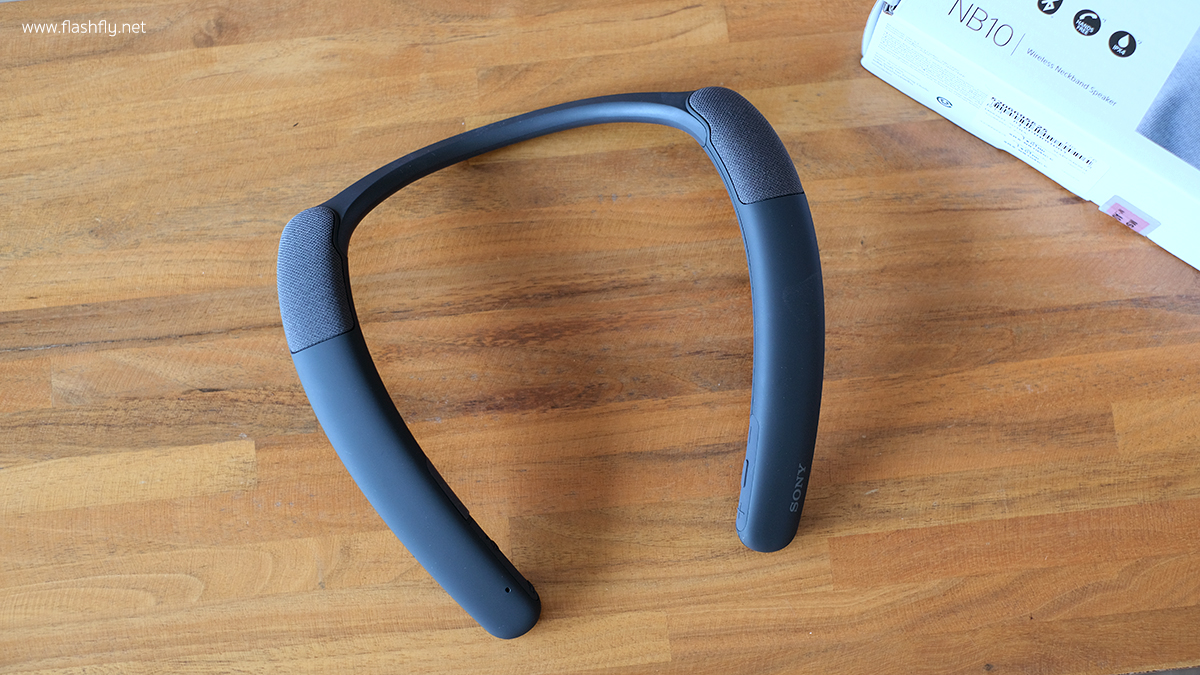 Sony SRS-NB10 เป็นลำโพงที่ออกแบบมาสำหรับใช้งานคล้องบนบ่าของผู้ใช้งาน จึงมีลักษณะคล้ายตัว U และมีความโค้งที่รับเข้ากับด้านหลังคอ รวมถึงขาทั้ง 2 ข้างที่มีความโค้งรับเข้ากับช่วงบ่าและหน้าอก ตัวลำโพงมีดีไซน์ที่โค้งมนสวยงาม ดูดีเข้ากับการแต่งตัวต่างๆ ได้ง่าย ผิววัสดุจะเป็นแบบด้านเพื่อให้มีผิวสัมผัสที่ค่อนข้างหนืด สามารถยึดเกาะกับเสื้อผ้าได้ และยังให้ความรู้สึกที่พรีเมี่ยมอีกด้วย นอกจากนี้ยังใช้ส่วนประกอบของพลาสติกน้อยกว่า 10% เพื่อเป็นการแสดงถึงความตั้งใจในการลดผลกระทบต่อสิ่งแวดล้อมนั่นเอง