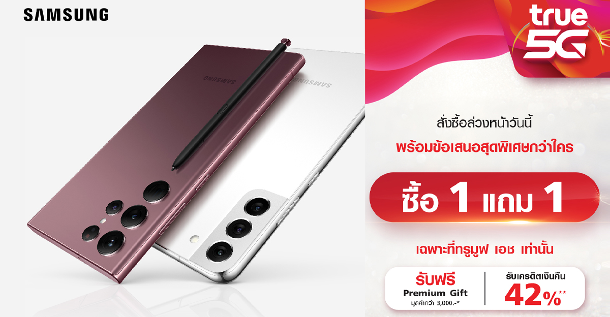 ซื้อสมาร์ทโฟน 5G Samsung Galaxy S22 Ultra 5G ความจุ 128 GB สีใดก็ได้ พร้อมสมัครใช้งานแพ็กเกจรายเดือน 5G Ultra Max Speed Plus เริ่มต้น 899 บาท รับฟรี สมาร์ทโฟน 5G Samsung Galaxy S22 5G ความจุ 128 GB สีใดก็ได้ พร้อมสมัครใช้งานแพ็กเกจรายเดือน 5G Ultra Max Speed Plus เริ่มต้น 899 บาท ระยะเวลาสัญญา 24 เดือน โดยจ่ายค่าบริการล่วงหน้าเครื่องละ 4,000 บาท ทั้ง 2 เครื่อง (ไม่รวมภาษีมูลค่าเพิ่ม) และชำระเงินมัดจำเป็นจำนวนเงิน 2,140 บาท ผ่านบัตรเครดิตเท่านั้น โดยรับสิทธิได้ที่ https://galaxys22.truemoveh.com/prebooking หรือ ติดต่อทรูช้อปทุกสาขาทั่วประเทศ หรือซื้อผ่าน Line@TrueStore (สิทธิ์มีจำนวนจำกัด กรุณาตรวจสอบสต็อค ณ จุดขาย) ตั้งแต่วันที่ 9 กุมภาพันธ์ 2565 – 3 มีนาคม 2565