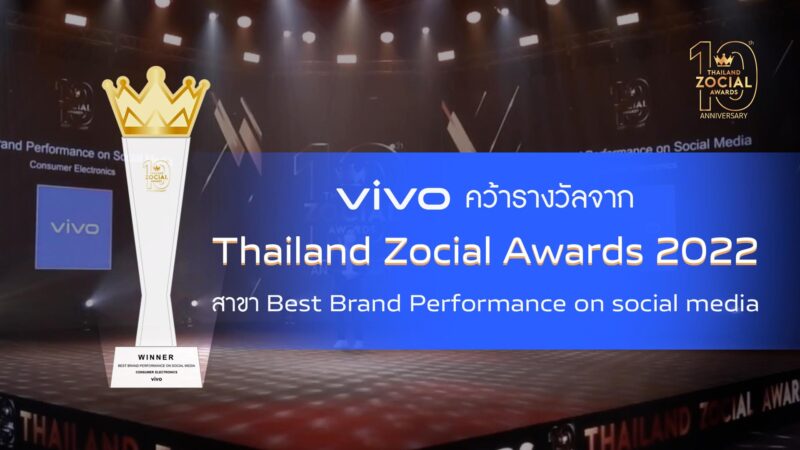 vivo แบรนด์สมาร์ตโฟนชั้นนำระดับโลก คว้ารางวัล ‘Best Brand Performance on Social Media’ สาขา Consumers Electronics จากงาน Thailand Zocial Awards 2022 งานประกาศรางวัลโซเชียลที่ยิ่งใหญ่ที่สุดของประเทศไทยจัดขึ้นเป็นครั้งที่ 10 โดย บริษัท ไวซ์ไซท์ (ประเทศไทย) จำกัด ตอกย้ำความเป็นผู้นำบนโลกโซเชียลมีเดียของ vivo ที่ครองใจผู้ใช้งานชาวไทยเสมอมา และไม่เคยหยุดเดินหน้าสร้างสรรค์ปรากฏการณ์ใหม่ๆ พร้อมปล่อยกิจกรรมสุดครีเอทีฟบนโลกออนไลน์ให้ร่วมสนุกกันอย่างต่อเนื่อง