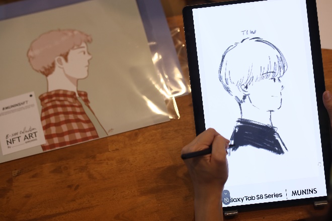 นอกจากนี้ เมื่อวันงานเปิดตัวเมื่อ 26 กุมภาพันธ์ที่ผ่านมา มุนินฺ ยังได้จัดกิจกรรมแจกลายเซ็นพร้อมภาพวาดให้เหล่าแฟนแบบเรียลไทม์ ผ่านการตวัดปากกา S Pen เวอร์ชันใหม่ของ Galaxy Tab S8 Ultra ลงบนหน้าจอ Super AMOLED ขนาด 14.6 นิ้ว ที่มีขอบหน้าจอบางเพียง 6.3 มิลลิเมตร  โดยแท็บเล็ตรุ่นนี้ยังสามารถใช้งานแอปพลิเคชัน Clip Studio Paint เพื่อเปลี่ยนสมาร์ทโฟนซัมซุงให้กลายเป็นจานสีดิจิทัล S Pen ให้เป็นพู่กัน และหน้าจอขนาดใหญ่ของ Galaxy Tab S8 เป็นผืนผ้าใบ โดยผู้ใช้สามารถเลือกเครื่องมือและรูปแบบหัวแปรงได้ตามต้องการ รวมถึงยังสามารถเลือกสีมาใช้โดยดึงมาจากภาพจริงที่เซฟไว้ในสมาร์ทโฟนได้อีกด้วย ซึ่งผลงานวาดภาพด้วย Galaxy Tab S8 Ultra นี้ นอกจากจะได้รับการส่งให้ผู้เข้าชมที่ใช้งานซัมซุง กาแลคซี่ทันทีผ่าน Quick Share แล้ว ยังจะถูกนำไปจัดแสดงใน Virtual Gallery ร่วมกับอีกหนึ่งภาพวาดพิเศษที่รอให้ทุกคนไปค้นพบในโลกเสมือนด้วยเช่นกัน
