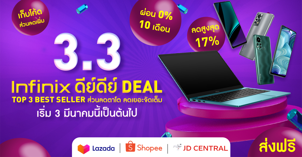 พิเศษ! คูปองส่วนลดอีก 500 บาท แถม ผ่อน 0% 10 เดือน สำหรับส่วนลดบน JD Central เฉพาะ 3 – 5 มีนาคมนี้เท่านั้น กดรับคูปองได้ที่ https://bit.ly/3nOUgec สำหรับผู้ที่สนใจสามารถติดตามรายละเอียดของกิจกรรมเพิ่มเติมได้ที่ www.facebook.com/InfinixMobileThailand