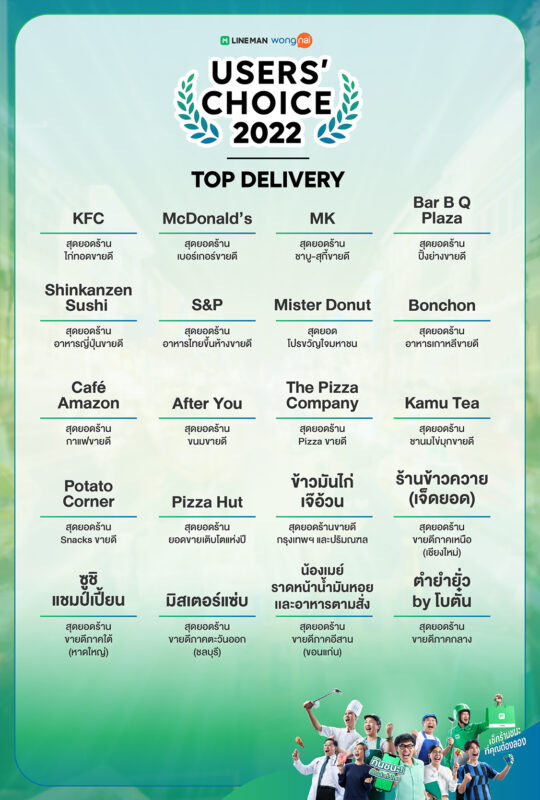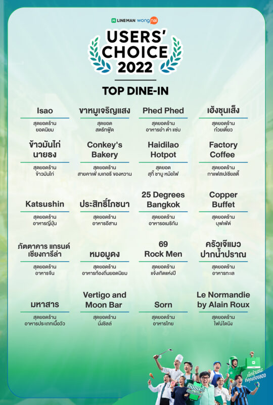 LINE MAN Wongnai เผยสุดยอด 540 ร้านอาหารทั่วไทยที่ผ่านการคัดเลือกจากรีวิว เรตติ้ง และยอดออร์เดอร์จากผู้ใช้ LINE MAN และ Wongnai กว่า 21 ล้านคน สำหรับ LINE MAN Wongnai Users’ Choice 2022 รางวัลเพื่อร้านอาหารที่ครอบคลุมร้านทุกรูปแบบตั้งแต่สตรีทฟู้ด เดลิเวอรี ไปจนถึง ไฟน์ไดน์นิง ตอบโจทย์พฤติกรรมนักกินของคนไทยที่หลากหลาย ซึ่งในปีนี้กลับมาในธีม “กินชนะคัดแล้ว ทั่วไทย” กับรางวัล ในสาขา Top Delivery (ที่สุดของร้านอาหารเดลิเวอรี) และรางวัล Top Dine-in (ที่สุดของร้าน ที่มอบประสบการณ์การกิน) รวมถึงเปิดตัวสัญลักษณ์ใหม่ “เวรี่กู๊ด” สัญลักษณ์แห่งการการันตี ร้านขายดี ที่มีการบริการยอดเยี่ยม