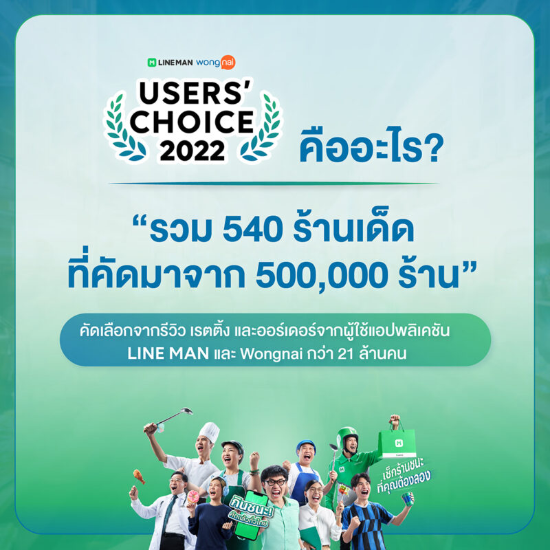 LINE MAN Wongnai ยังคงตั้งใจเป็นตัวกลางระหว่างเหล่านักกินและร้านอาหารทั่วประเทศไทย โดยการมอบ รางวัล LINE MAN Wongnai Users’ Choice 2022 ให้กับเหล่าร้านอาหาร เพื่อเป็นเครื่องการันตีถึงการรักษาคุณภาพ และมาตรฐานของร้านอาหาร และนอกจากนี้ LINE MAN Wongnai User’s Choice 2022 จะเป็นคู่มือหาร้านอาหาร ให้กับคนไทย ที่ไม่ว่าจะไปที่ไหนในประเทศไทย ก็สามารถตามไปลิ้มลองรสชาติทั้ง 540 ร้าน ที่ผ่านการตัดสินจากคนไทย ทั่วประเทศได้ที่ https://www.wongnai.com/users-choice?regions=9681