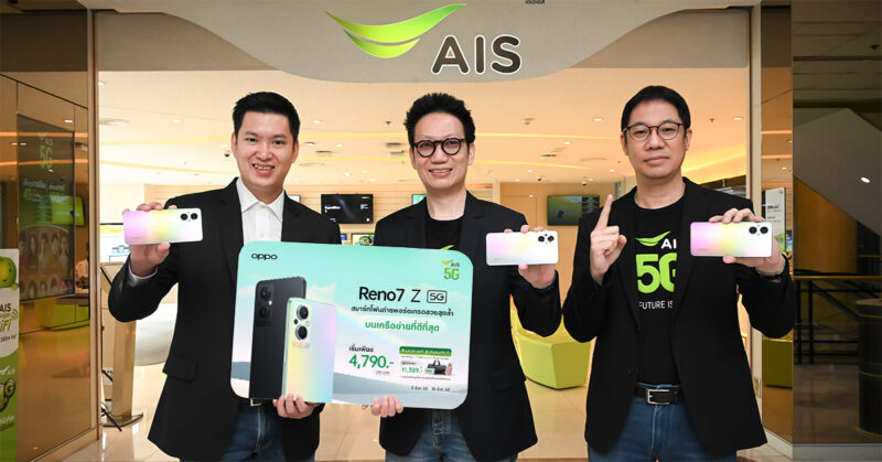 OPPO ผนึกกำลังกับ เอไอเอส นำโดย คุณทวีเกียรติ ธัญญวัฒนกุล หัวหน้าแผนกงานบริหารธุรกิจอุปกรณ์สื่อสาร (คนที่ 2 จากซ้าย) และ คุณทิฐินันท์ โชตินันทน์ หัวหน้าแผนกงานการตลาดด้านผลิตภัณฑ์ บริษัท แอดวานซ์ อินโฟร์ เซอร์วิส จำกัด (มหาชน) หรือ AIS (คนที่ 1 จากขวา) จับมือผนึกกำลังกับพันธมิตร คุณชานนท์ จิรายุกุล ประธานกรรมการอาวุโสฝ่ายบริหาร ออปโป้แห่งประเทศไทย (คนที่ 1 จากซ้าย) เปิดจอง OPPO Reno7 Z 5G สมาร์ทโฟน 5G ที่ถ่ายภาพพอร์ตเทรตได้ดีที่สุด ในราคาสุดคุ้มเริ่มต้นเพียง 4,790 บาท พร้อมข้อเสนอสุดพิเศษมากมาย เมื่อจองผ่านเอไอเอส ตั้งแต่วันนี้ – 16 มีนาคมนี้