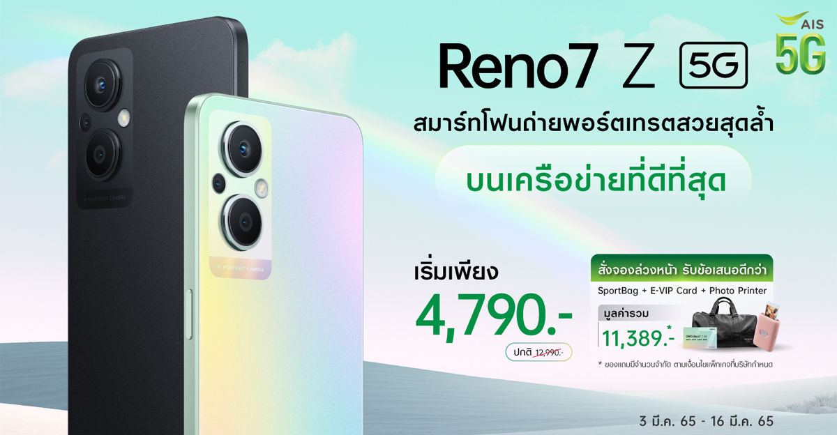 เป็นเจ้าของ OPPO Reno7 Z 5G ในราคาที่คุ้มค่ามากกว่าเดิม กับโปรโมชั่นสุด Exclusive เมื่อจองผ่านเอไอเอส ที่เอไอเอสช็อปและร้านเทเลวิซทุกสาขา ตั้งแต่วันนี้– 16 มีนาคมดังนี้