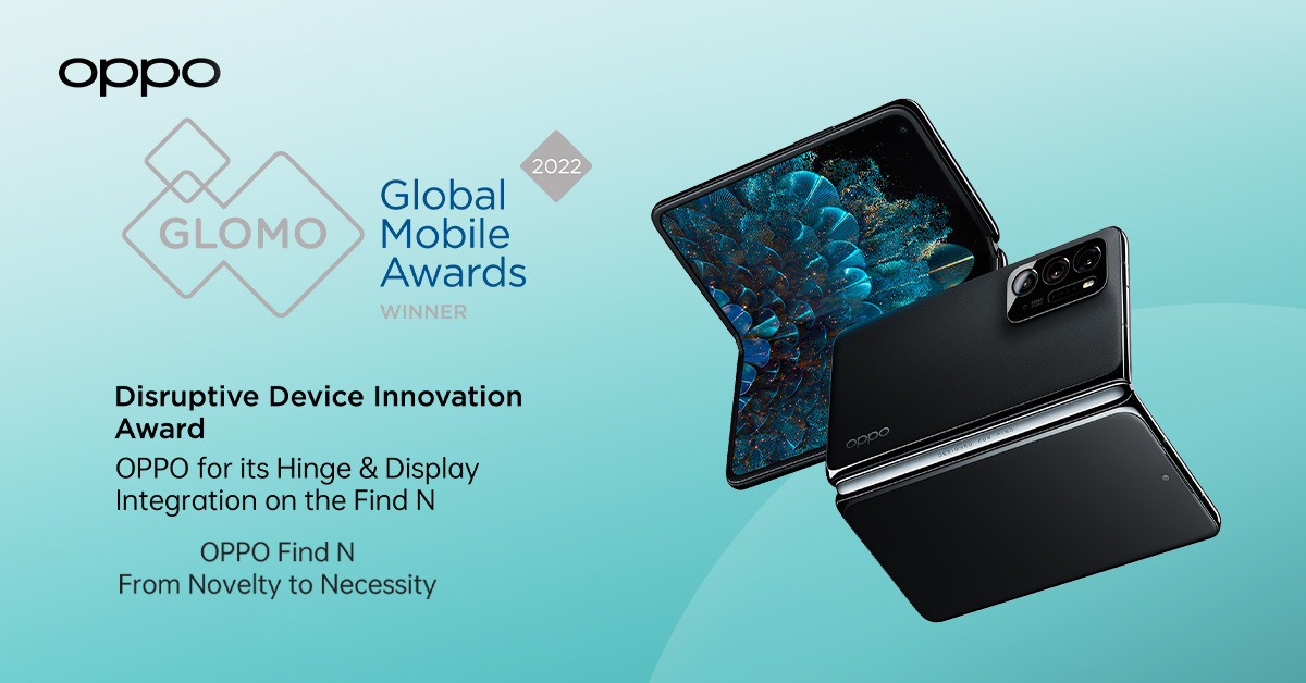 สัปดาห์ที่ผ่านมา OPPO ได้รับประกาศรางวัล Disruptive Device Innovation Award จาก 2022 Global Mobile (GLOMO) Awards ที่งาน MWC 2022 Barcelona รางวัลนี้เป็นรางวัลที่ยกย่อง OPPO สำหรับการบูรณาการบานพับและจอแสดงผลบน Find N โดยได้รับการประกาศรางวัลในงาน virtual โดยมี Sasha Twining และ Justin Springham จาก Mobile World Live ร่วมเป็นพิธีกร และมีการสตรีมไปยังผู้ชมทั่วโลกผ่าน LinkedIn