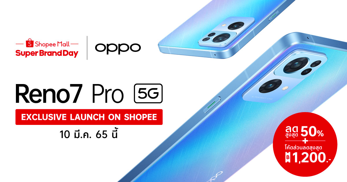 แบรนด์สมาร์ทโฟนชั้นนำ OPPO ได้เปิดตัว OPPO Reno7 Series 5G รุ่นล่าสุด ซึ่งวางจำหน่ายแบบสุดเอ็กซ์คลูซีฟผ่าน OPPO Official store บน Shopee Mall ห้างสรรพสินค้าออนไลน์ชั้นนำระดับภูมิภาค มอบดีลที่ดีที่สุดจากแบรนด์และร้านค้าปลีกโดยตรง แคมเปญOPPO Super Brand Day ในระดับภูมิภาคร่วมกับ Shopee จะจัดขึ้นใน 6 ตลาดด้วยกัน โดยจัดในวันที่ 10 มีนาคม 2565 พร้อมรับดีลสุดพิเศษ เช่น รับของสมนาคุณพิเศษมูลค่า 5,398 บาท เมื่อซื้อ OPPO Reno7 Pro 5G นับตั้งแต่มีการเปิดตัวใน Shopee OPPO Reno7 5G ได้รับคะแนนอันโดดเด่นเฉลี่ยถึง 4.8 ดาว มอบความประทับใจแก่ผู้ใช้งานด้วยดีไซน์ฝนดาวตก ขอบเหลี่ยม บางเฉียบ คุณสมบัติกล้องพอร์ตเทรตที่ถ่ายภาพได้เสมือน DSLR และฟีเจอร์การถ่ายภาพด้วย AI ที่อัปเดต ระดับแฟลกชิป