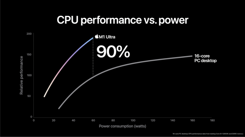M1 Ultra รองรับ RAM สูงถึง 128GB มี CPU 20-Core และ GPU 64-Core พร้อมกับ Neural Engine 32-Core แรงกว่า M1 ถึง 8 เท่า โดยมีประสิทธิภาพสูงและประหยัดพลังงานกว่าชิปเดสท็อปทั่วไปถึง 90%