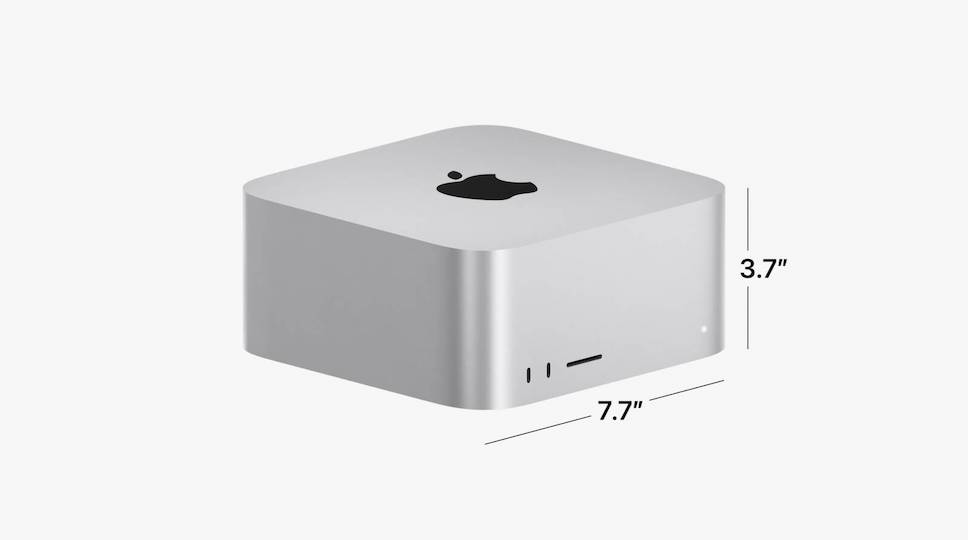 Mac Studio ดีไซน์มาในรูปทรงกล่อง สร้างขึ้นจากวัสดุอะลูมิเนียมชิ้นเดียว มีความสูง 3.7 นิ้ว กว้างและลึก 7.7 นิ้ว รองรับพอร์ตเชื่อมต่อ Thunderbolt 4 (4 ช่อง), Ethernet 10GB, USB-A (2 ช่อง), HDMI และช่องเสียบหูฟัง ส่วนการเชื่อมต่อไร้สาย รองรับ Wi-Fi 6 และ Bluetooth 5