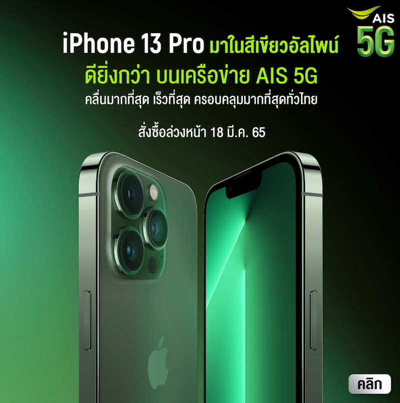 iPhone 13 Pro Max และ iPhone 13 Pro มาในสีเขียวอัลไพน์ ดียิ่งกว่า บนเครือข่าย AIS 5G เตรียมสั่งซื้อล่วงหน้า 18 มี.ค. 65
