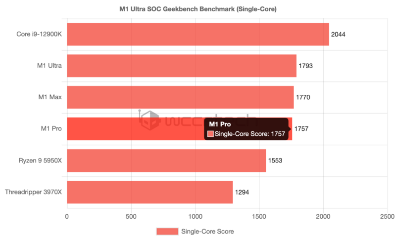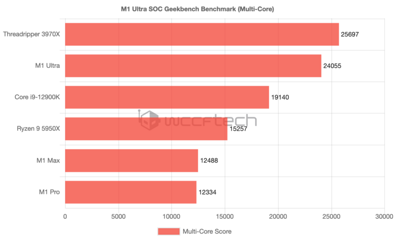 แต่เมื่อเป็นคะแนน Mult-Core ทางชิป M1 Ultra ที่ได้ 24055 คะแนน ทำได้ดีกว่า Intel Alder Lake Core i9-12900K ที่ได้ 19140 คะแนนอยู่พอสมควร แต่ทั้งหมดจะแพ้ AMD Ryzen Threadripper 3970X ที่ได้ 25697 คะแนน แต่ AMD Ryzen Threadripper 3970X กลับทำคะแนนในแบบ Single-Core ได้ไม่ดีเท่าไรนัก โดยได้ไป 1294 คะแนน