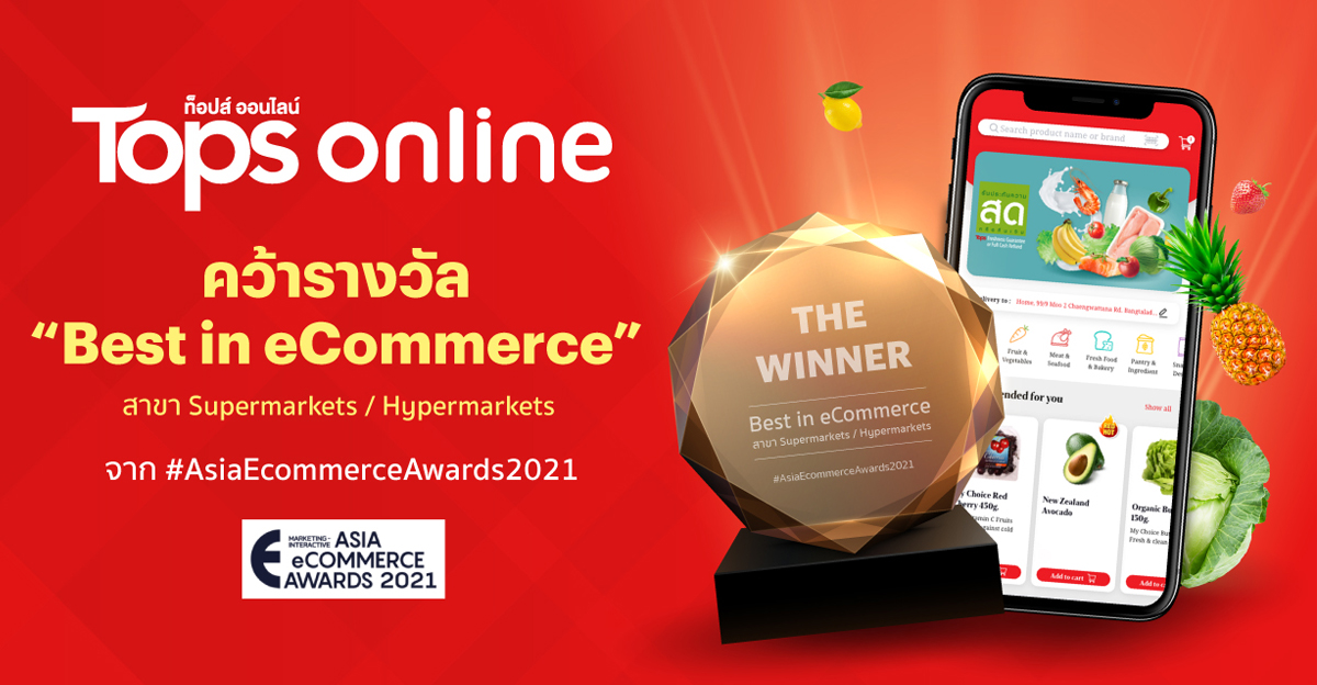 โดยเวที Asia eCommerce Awards 2021 ประเทศสิงคโปร์ จัดขึ้นต่อเนื่องเป็นปีที่ 4 เพื่อมอบรางวัลแก่ทุกแบรนด์ที่มีศักยภาพโดดเด่นเหนือคู่แข่งในด้านต่างๆ โดยครอบคลุม 36 สาขา เป็นเวทีที่ร่วมเชิดชูเกียรติแบรนด์ค้าปลีกออนไลน์ในภูมิภาคเอเชียตะวันออกเฉียงใต้ ที่สามารถก้าวทันทุกความเปลี่ยนแปลงและมีกลยุทธ์ในการบริหารธุรกิจแม้ว่าจะได้รับผลกระทบจากโควิด-19 จึงนับได้ว่ารางวัลดังกล่าวได้ตอกย้ำภาพลักษณ์ “Tops online” (ท็อปส์ ออนไลน์) ที่มีเป้าหมายการเป็นเบอร์ 1 ด้านธุรกิจซูเปอร์มาร์เก็ตออนไลน์ ที่พร้อมสร้างประสบการณ์การช้อปปิ้งอย่างไร้รอยต่อ ด้วยมาตรฐานบริการระดับเวิลด์คลาส อีกทั้งยังมีความโดดเด่นเหนือคู่แข่งอย่างแท้จริง จากการคัดสรรสินค้าที่ดีที่สุดและตรงใจผู้บริโภคมากที่สุดครบทุกหมวดหมู่กว่า 20,000 รายการ โดยเฉพาะอาหารสดอัดแน่นด้วยคุณภาพมานำเสนอบนแพลตฟอร์มออมนิแชลแนล (Omni-Channel) ที่สะดวกต่อการเลือกสรรได้ตลอด 24 ชั่วโมง อีกทั้งยังมาพร้อมบริการที่รวดเร็ว ส่งไวใน 1 ชั่วโมง