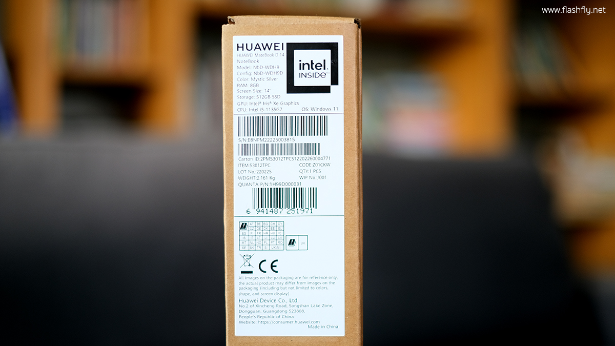 มีการเปลี่ยนสีของกล่องจากกล่องสีขาวมาเป็นกล่องสีน้ำตาล ซึ่งเป็นการเปลี่ยนมาใช้กระดาษรีไซเคิลเพื่อให้ตัวกล่องผลิตภัณฑ์รักษ์โลกมากขึ้น โดยด้านหน้ามีเพียงโลโก้ HUAWEI และรูปวาดลายเส้นที่แสดงบางส่วนของแล็ปท็อป และด้านข้างมาพร้อมกับรายละเอียดสเปกของตัวเครื่องคร่าวๆ และโลโก้ Intel ที่เผยให้เห็นว่า MateBook D 14 รุ่นนี้ใช้ชิป Intel นั่นเอง
