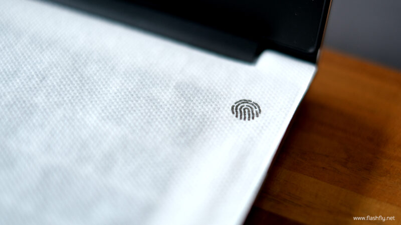 และในตัวเครื่องก็มีแผ่นรองที่ป้องกันรอยขีดข่วนในระหว่างที่อยู่ในกล่อง โดยมีการพิมพ์ตำแหน่งสแกนลายนิ้วมือเข้ามา ซึ่งแล็ปท็อปรุ่นนี้จะมีการใช้ปุ่มสแกนลายนิ้วมือร่วมกับปุ่มพาวเวอร์นั่นเอง