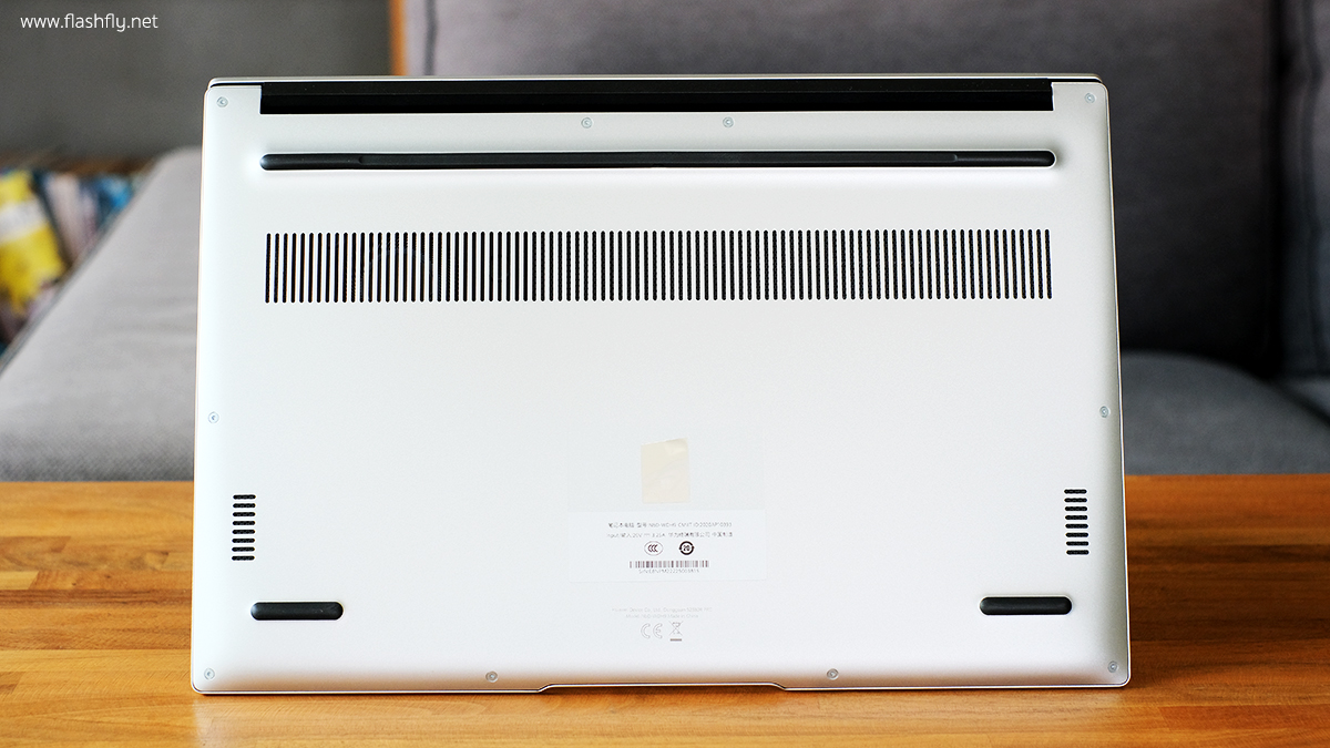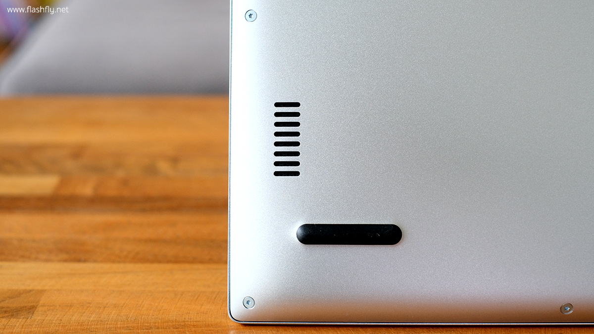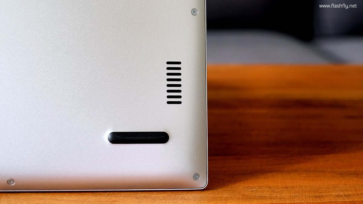 พลิกมาดูที่ใต้เครื่อง จะพบช่องตะแกรงระบายความร้อนขนาดใหญ่ พร้อมติดแถบยางแบบยาวพิเศษไว้ด้านท้าย และด้านหน้าอีก 2 จุดซ้ายและขวา ช่วยป้องกันตัวเครื่องเมื่อวางบนพื้นราบ และยังช่วยกันลื่นได้อีกด้วย ทำให้วางแล็ปท็อปได้อย่างมั่นคง และด้านซ้ายและขวาตรงมุมของตัวเครื่องจะเป็นลำโฟงที่วางไว้ทั้ง 2 ข้าง
