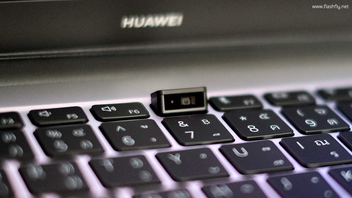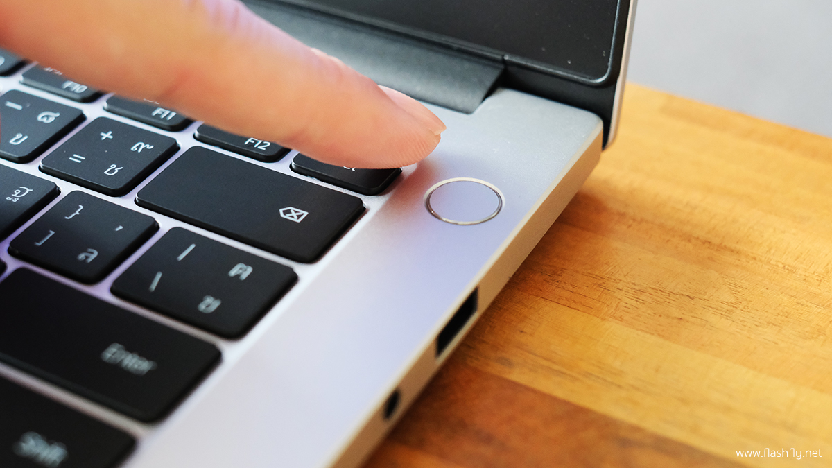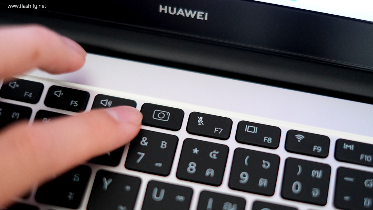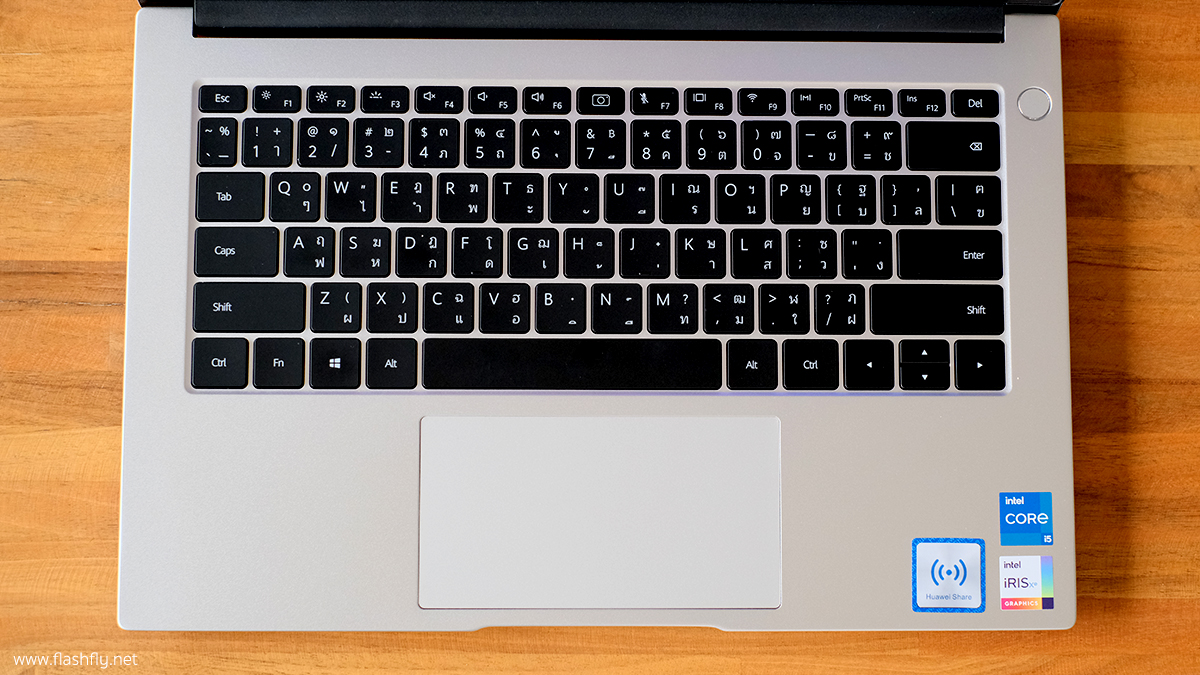 แป้นพิมพ์ของ MateBook D 14 เป็นแบบเรืองแสงขนาดเต็ม พิมพ์ง่าย เสียงเบา และให้สัมผัสนุ่มนวลระหว่างพิมพ์ ยังคงมาพร้อม Fingerprint Power Button สามารถล็อกอินเข้าเครื่องได้เพียงแสกนลายนิ้วมือ