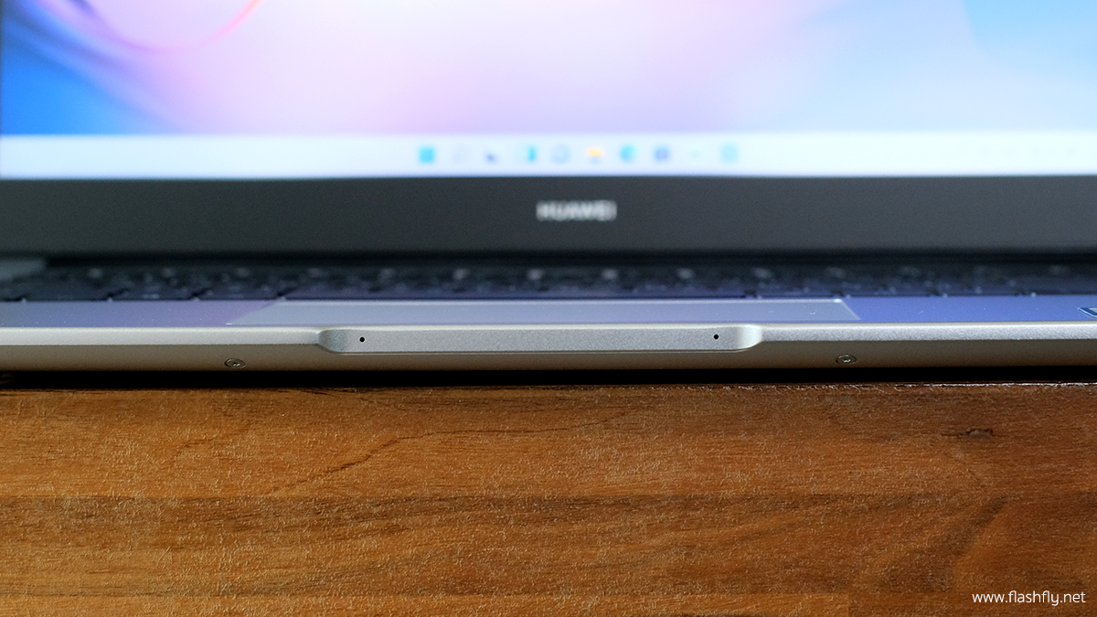 และตรงขอบที่เป็นช่องสำหรับยกหน้าจอก็จะวางไมโครโฟนไว้ 2 จุด เพื่อการตรวจจับเสียงในเวลาวิดีโอคอลหรือประชุมออนไลน์ต่างๆ