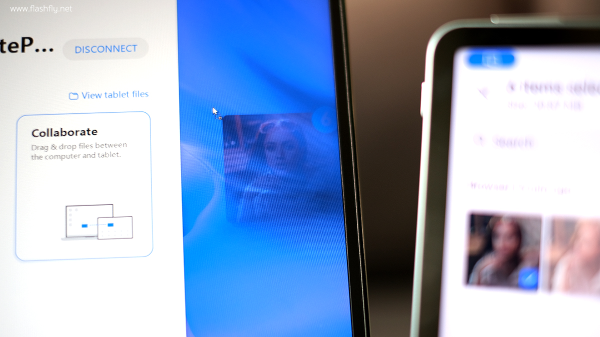 และใน Collaborate Mode จะทำให้แล็ปท็อปสามารถแชร์คีย์บอร์ดและเมาส์ร่วมกันสำหรับใช้งานกับแท็บเล็ตทั้งสองหน้าจอ ซึ่งแท็บเล็ตจะตรวจจับตำแหน่งการใช้งานของแล็ปท็อปโดยอัตโนมัติ ทำให้สามารถลากไฟล์จากแท็บเล็ตมายังแล็ปท็อป หรือจะลากจากแล็ปท็อปไปยังแท็บเล็ตเพื่อโอนถ่ายไฟล์ระหว่างอุปกรณ์ได้อย่างงายดาย